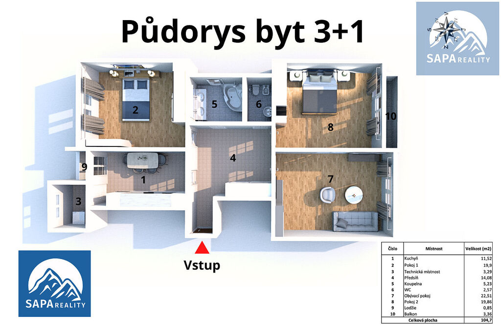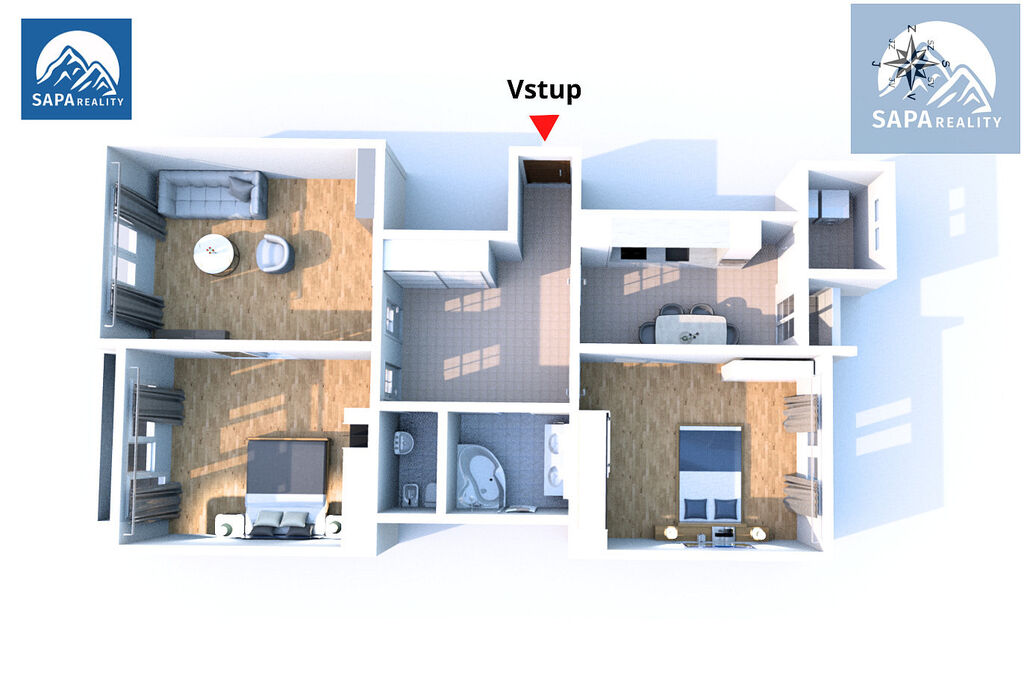 Byt prošel rekonstrukcí a je připraven k okamžitému užívání. Kvalitní vybavení zahrnuje plně zařízenou kuchyňskou linku se spotřebiči, vestavěné skříně, elektrické venkovní žaluzie a podlahové topení v koupelně. Z jedné ložnice je přímý vstup na balkon (3,36 m²), z kuchyně pak na menší lodžii (0,85 m²). K bytu náleží také sklep (5 m²) a vyhrazené parkovací stání přímo pod balkonem bytu.