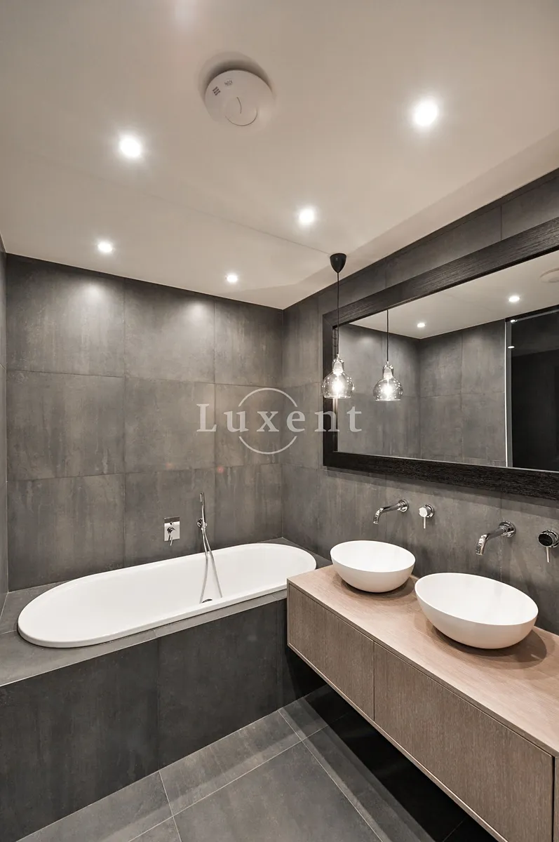 Dispozice nabízí vstupní chodbu, koupelnu se sprchovým koutem, toaletou a bidetem, master ložnici s en suite koupelnou se sprchovým koutem a toaletou, další ložnici a prostorný obývací pokoj s kuchyňským koutem vybaveným všemi spotřebiči – indukční varnou deskou, digestoří, horkovzdušnou troubou, myčkou a lednicí s mrazákem. Součástí vybavení je i pračka se sušičkou.