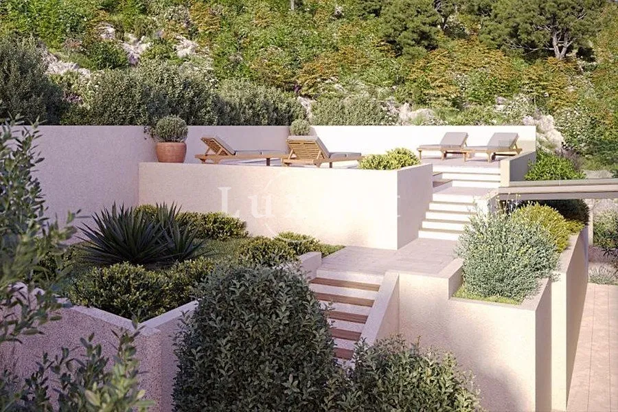 Za vilou je prostor pro bazén a sluneční terasu, které díky chytrému dispozičnímu řešení poskytují otevřený výhled na moře. K vile náleží také tři parkovací místa.