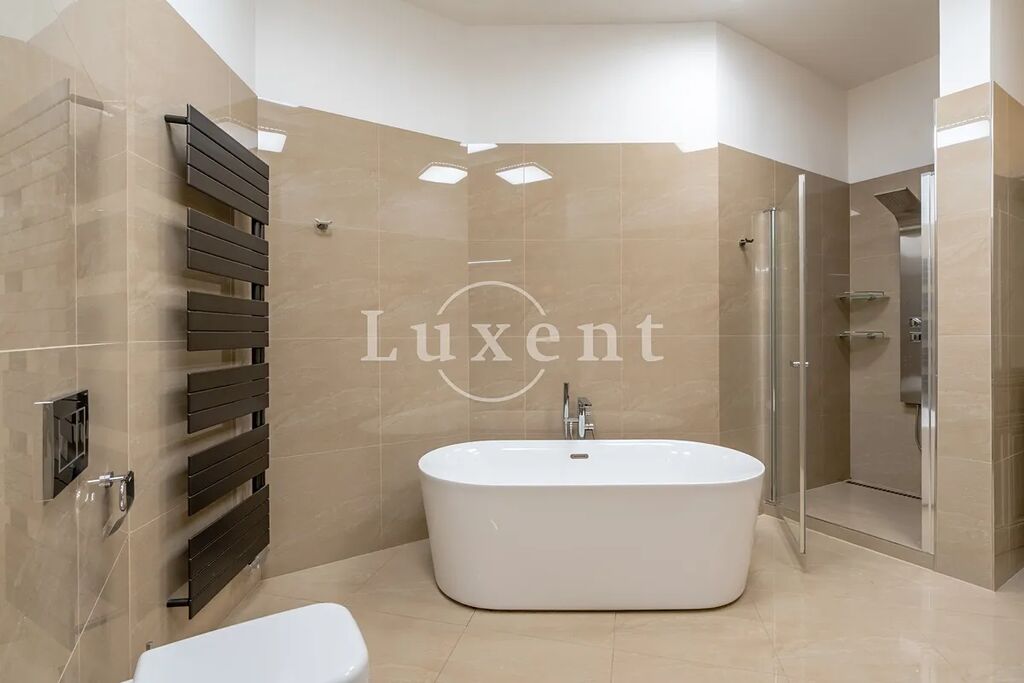 V bytě se nachází kvalitní laminátová plovoucí podlaha a dlažba, vestavěné skříně ve vstupní hale. Okna po celém obvodu bytu zajišťují nadměrné množství denního světla. Byt se pronajímá částečně zařízený včetně TV s audio sestavou Bang & Olufsen a všech kuchyňských spotřebičů.