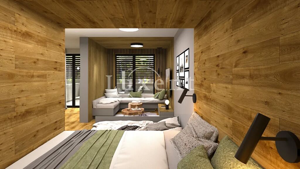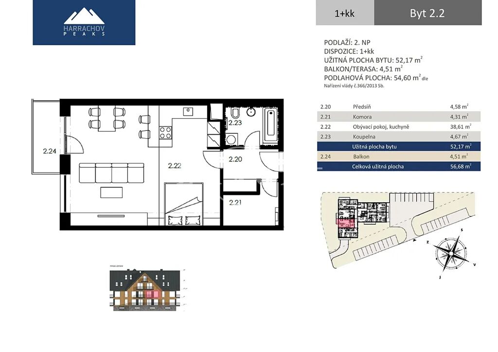 Nabízíme apartmán o dispozici 1+kk v 2.NP luxusního projektu HARRACHOV PEAKS. Apartmán má obytnou plochu 52,17 m2 a celkovou užitnou plochu 56,68 m2 vč. balkonu (4,51 m2). Pomocí připraveného individuálního architektonického návrhu vestavby je možné získat originální dispozici blížící se 2+kk (viz vizualizace ve dvou variantách). Projekt je dokončen a zkolaudován a vzorový byt je otevřen k prohlídkám a ukazuje možné dispoziční řešení i pro tento apartmán. V suterénu projektu je majitelům apartmánů k dispozici wellness se saunou a vířivkou a vybavené fitness.