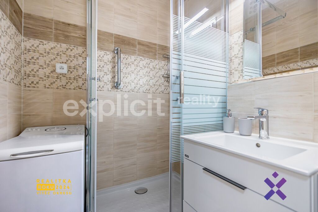 Koupelna prošla rekonstrukcí a je vybavena moderním sprchovým koutem, umyvadlem se skříňkou a pračkou.