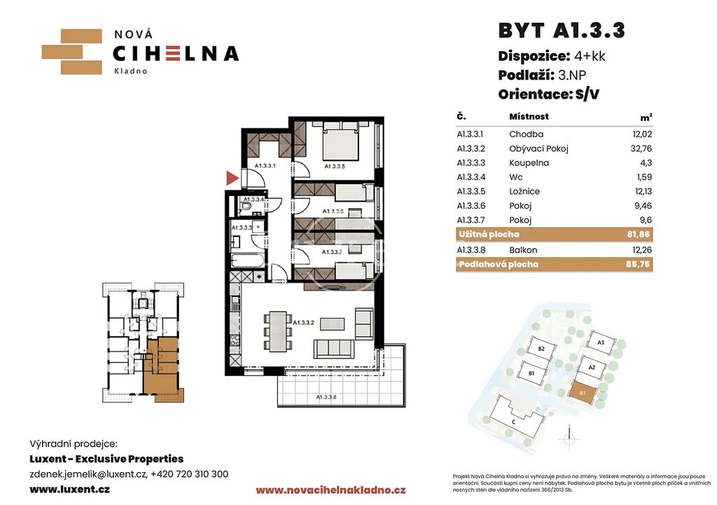 Nabízíme k prodeji byt 4+kk o podlahové ploše 85,75 m² s balkonem 12,26 m² v mimořádně úsporném developerském projektu Nová Cihelna Kladno vznikajícím v městské čtvrti Kladno – Rozdělov.