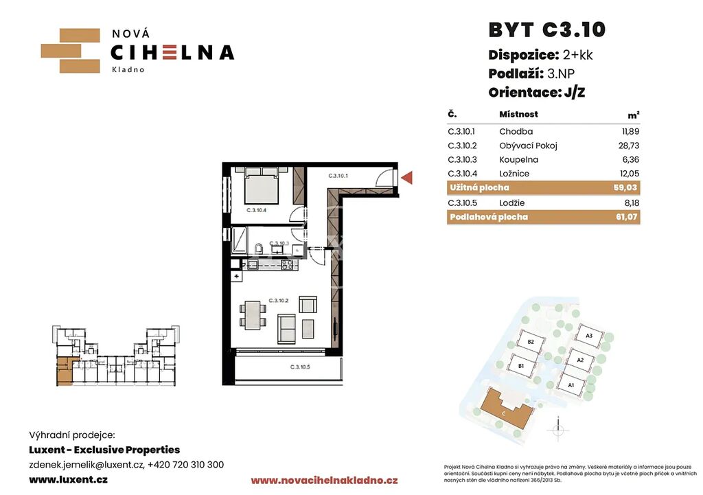 Nabízíme k prodeji byt 2+kk o podlahové ploše 61,07 m² s lodžií 8,18 m² v mimořádně úsporném developerském projektu Nová Cihelna Kladno vznikajícím v městské čtvrti Kladno – Rozdělov.