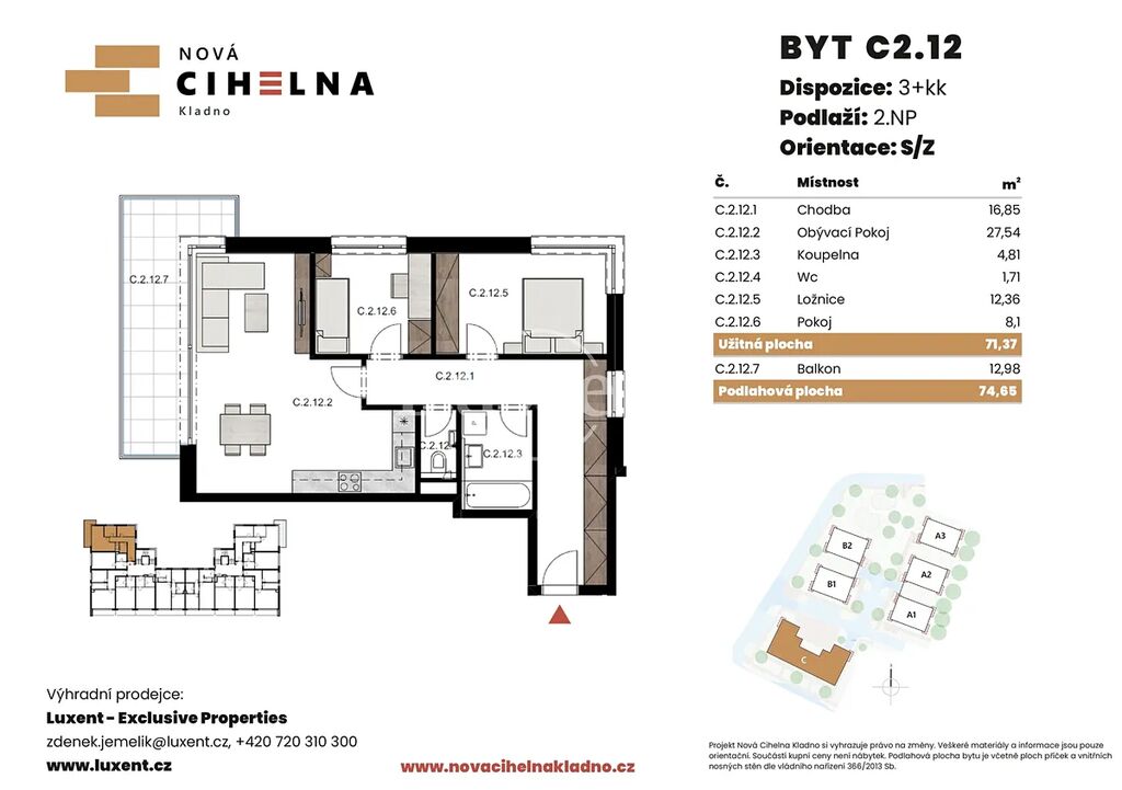 Nabízíme k prodeji byt 3+kk o podlahové ploše 74,65 m² s balkonem 12,98 m² v mimořádně úsporném developerském projektu Nová Cihelna Kladno vznikajícím v městské čtvrti Kladno – Rozdělov.