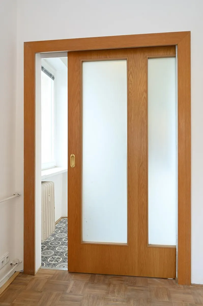 Samostatný kuchyńský kout vybavený sporákem, troubou, digestoří, lednicí., kuchyňský kout lze zavřít šoupacími dveřmi.