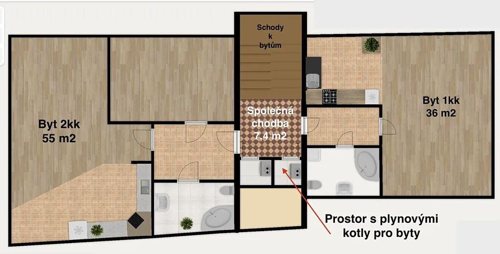 Současně s tímto bytem je v podkroví k prodeji ještě druhá jednotka. Nabízí se tak jedinečná příležitost spojit obě nemovitosti a získat prostorné a luxusní bydlení o celkové ploše 98 m² v samém srdci Kutné Hory. Pro lepší představu přikládáme půdorys celého podkroví, který znázorňuje obě jednotky.