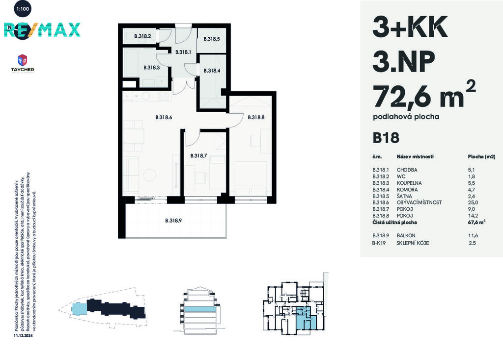 V daném inzerátu představujeme byt typu 3+kk o celkové podlahové ploše 72,6 m2 s prostorným balkonem o samostatné ploše 11,6 m2. Byt bude situován v 3. NP podlaží. Vstupem se ocitněte v předsíní, velikost které umožňuje pohodlně umístit dlouhou vestavenou skříň. Z předsíně se dostanete do 25m2 velké obytné místnosti zároveň sloužící jako kuchyně a jídelna. Zde byt se rozděluje na další dvě časti: oddělenou ložnici o výměře 14,2m2 s vlastní oddělenou šatnou a velkého pokoje s výstupem na balkon. Dle většího pohodlí budoucích majitelů WC a koupelna jsou oddělené ve všech plánovaných bytech. Pokud potřebujete získat lepší dispoziční představu jsme připravili pro vás půdorys, který můžete najít na obrazových materiálech projektu. Standardně byt vybaven dřevěným podlahovým krytím v obytných místnostech a dlažbou v sanitárních místnostech, však je možnost se domluvit s developerem na individuálně změně těchto materiálů. Sklep 2,5 m2 je v ceně bytu.