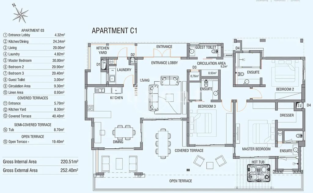 Dispozice bytu o obytné ploše 138 m2 zahrnuje tři ložnice s vlastními koupelnami (30 m2, 21 m2, 20 m2), obývací pokoj (20 m2) s kuchyní (24 m2) s velkými arkýřovými okny, skrze které se dostanete na prostornou terasu (69 m2), která je z části zastřešená. Součástí bytu je také prádelna (5 m2), toaleta pro hosty (3 m2), kuchyňský dvorek (8 m2), chodba (9 m2) a vstupní hala (4 m2). K tomuto apartmánu také patří dvě parkovací stání.