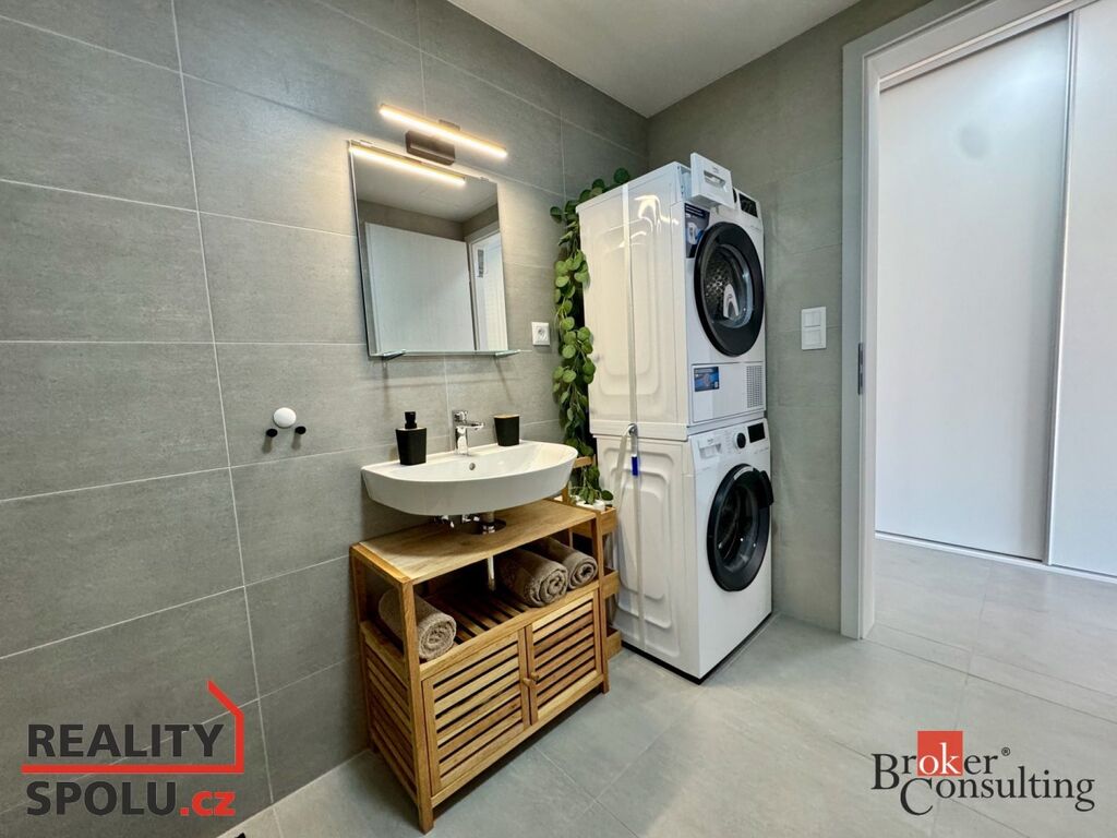 Z předsíně vstoupíte do luxusní koupelny, která obsahuje WC, pračku, sušičku a prostorný sprchový kout. Následuje obývací pokoj s kuchyňským a jídelním koutem. Z pokoje vstoupíte na lodžii s výhledem do vnitrobloku, který nabízí klidné posezení a dětské hřiště.