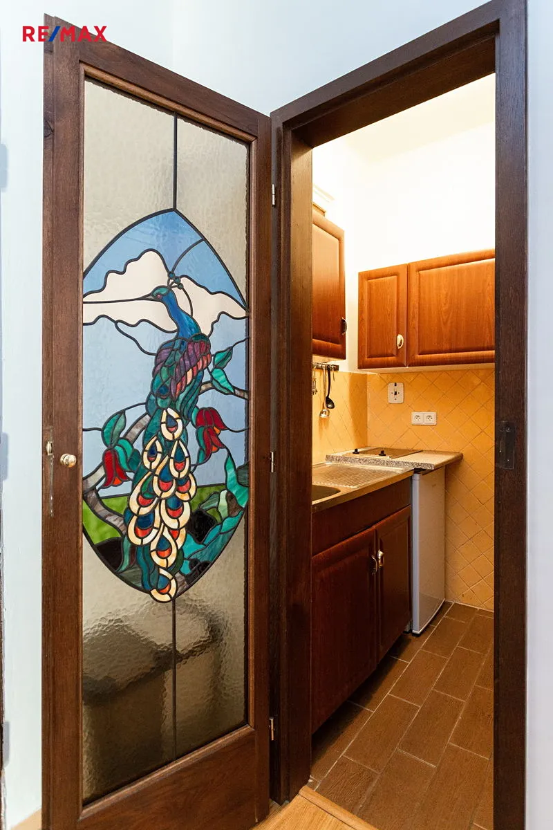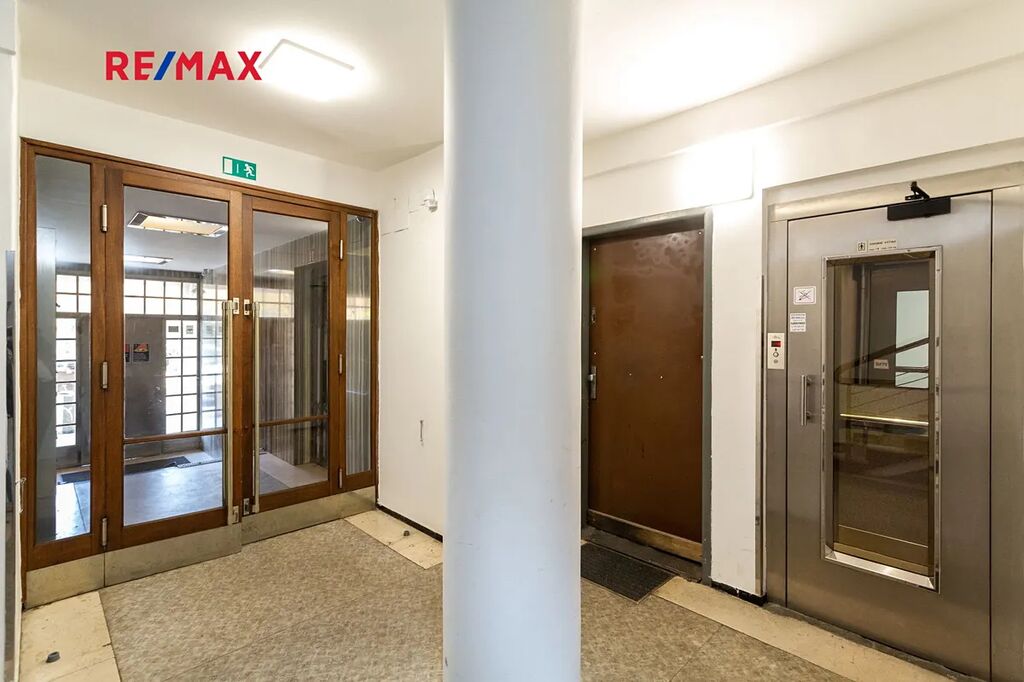 The apartment has 60 m² and is located on the 5th floor of a well-kept residential building with an elevator. The layout offers a living room with a view of Ostrovní street, a bedroom facing a quiet courtyard, a small but functional kitchen, a spacious bathroom with bathtub, a separate toilet, an entrance hall and a storage room. The kitchen is rather basic, which is the only compromise of an otherwise very comfortable and representative apartment.