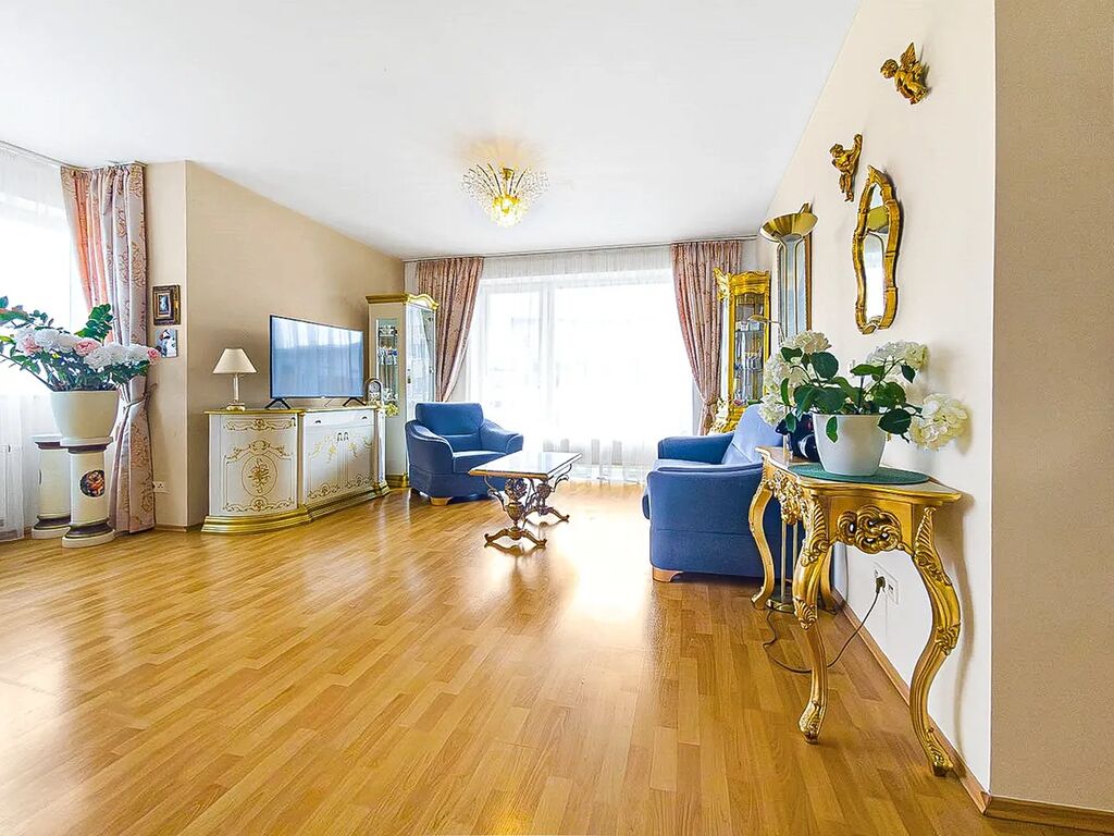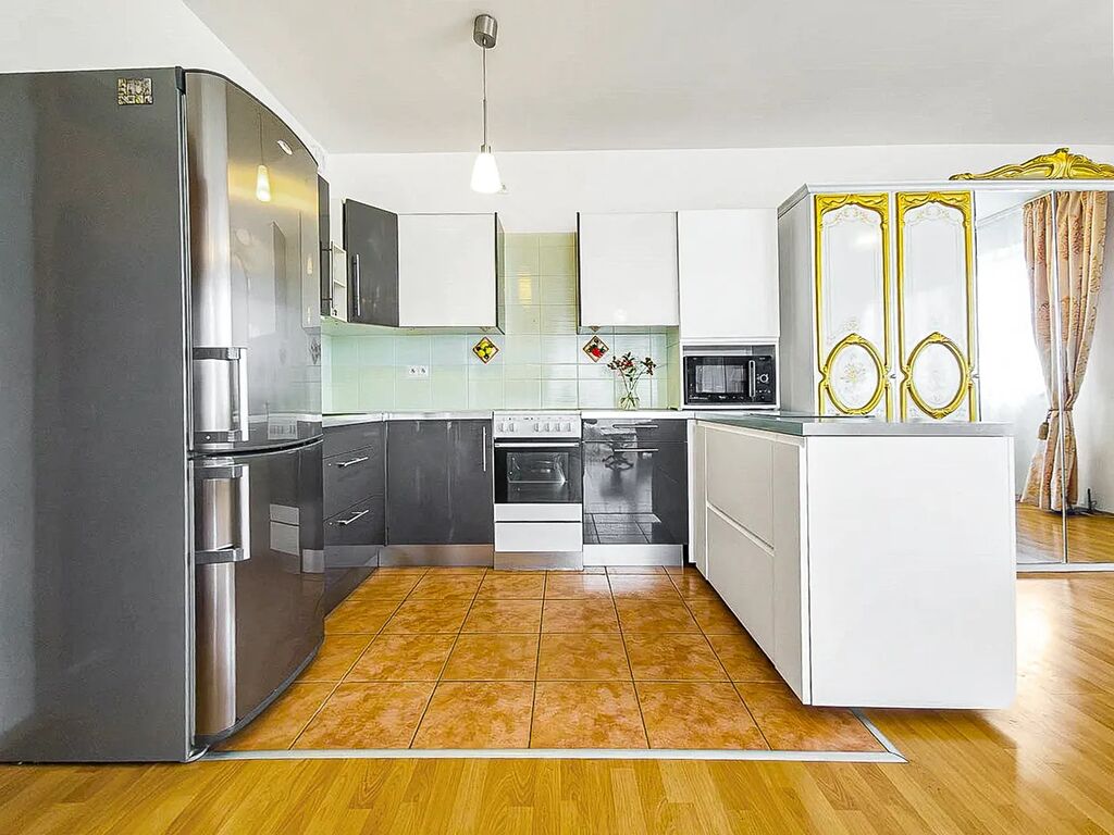 Obývací pokoj s kuchyňským koutem tvoří centrální část bytu. Světlý a prostorný interiér je vybaven elegantním nábytkem a působí reprezentativně i útulně zároveň. Kuchyňská linka je osazena moderními spotřebiči a poskytuje dostatek úložného prostoru. Z obývací části je přímý vstup na balkon, který nabízí možnost příjemného posezení s výhledem do okolí.