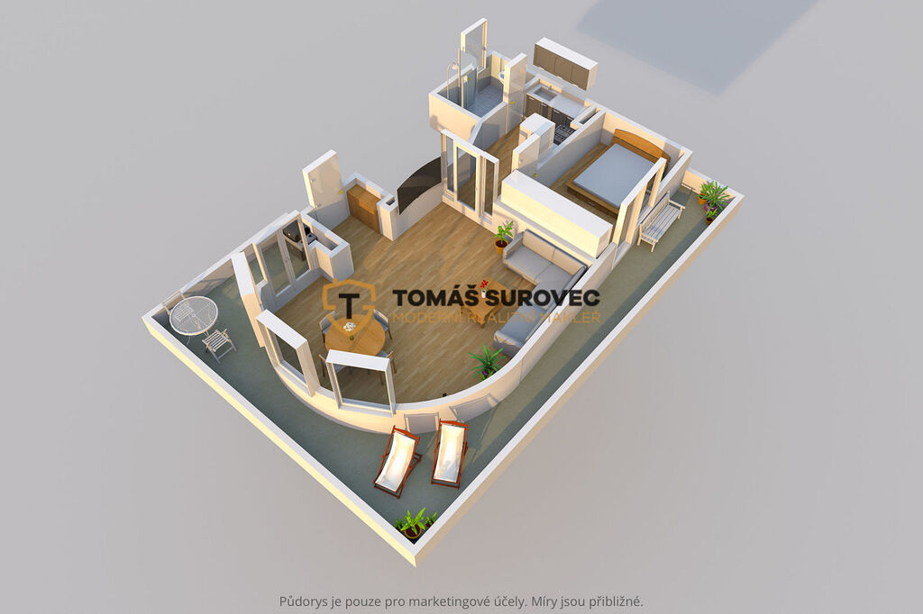 Jakmile vstoupíte dovnitř, projdete chodbou a rázem se ocitnete v útulném obývacím pokoji, jehož plocha činí celých 30 m². Jako první vás pravděpodobně zaujme oku lahodící architektonické provedení prostorného interiéru s obloukovou stěnou a trojicí velkých oken. Nejen z obývací části, ale také z oddělené ložnice pak můžete vyjít na terasu, jejíž celková plocha je dokonce ještě větší - 35 m². Zlínský byt 2+1 k pronájmu doplňuje z hlediska dispozičního řešení ještě samostatná kuchyň s kuchyňskou linkou a koupelna.