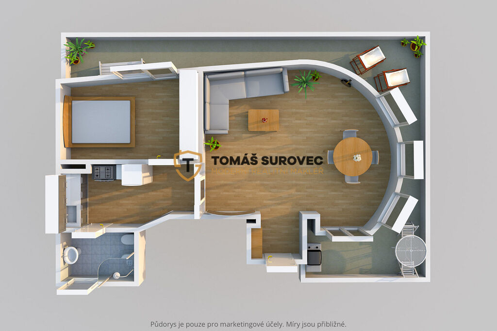 Prostorný byt s novou kuchyňskou linkou a terasou po obou stranách, kopírující obloukem roh ulice, nabízí doslova za rohem úplně vše, co od samotného středu krajského města očekáváte. Počínaje náměstím s OC Zlaté Jablko a multikinem přes kostel či univerzitní budovy až po restaurace a bary. Například oblíbená zlínská divadelní scéna je hned naproti přes cestu.
