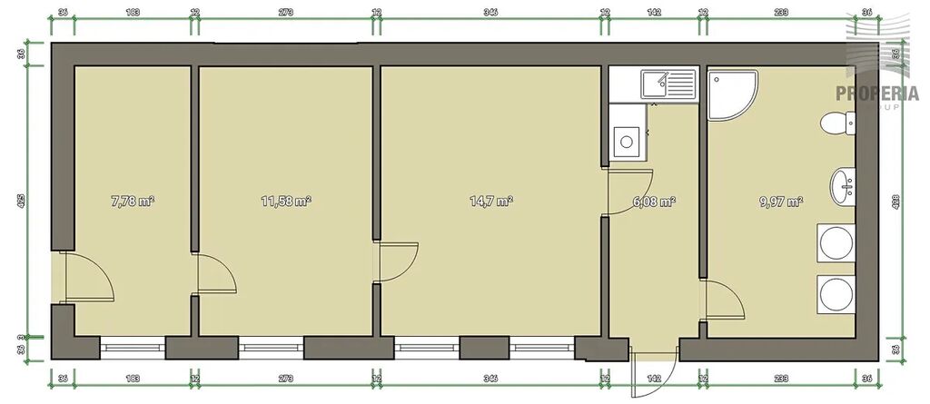Prostorná koupelna a kompaktní kuchyň pokryjí veškeré denní potřeby. Dva průchozí pokoje poskytnou místo pro odpočinek i práci. Šatna s oknem může sloužit jako šikovná pracovna či menší pokoj.