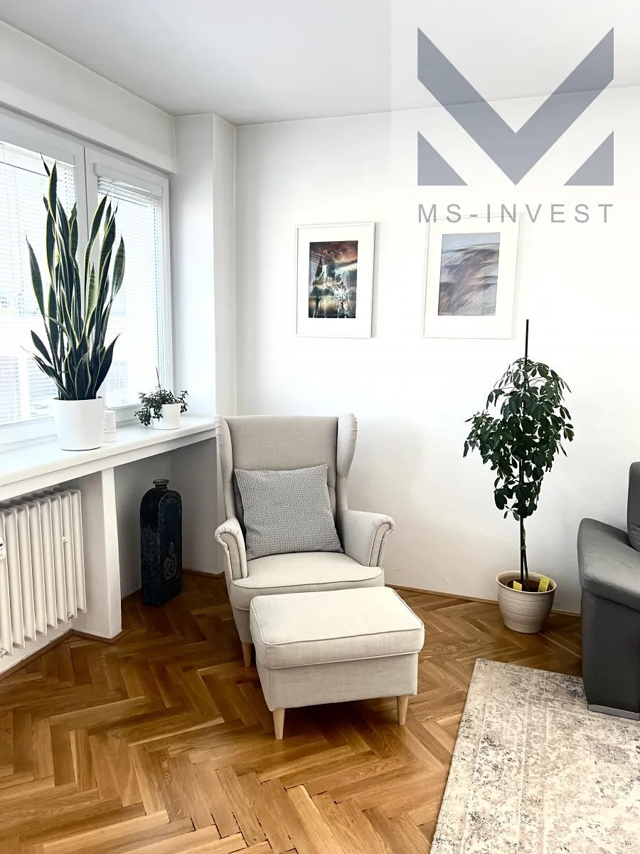 Citlivě zrekonstruovaný byt s původními prvky se nachází ve druhém patře domu s výtahem a má podlahovou plochu 83 m2. Je tvořen třemi pokoji (dva velkorysé a jeden menší používaný jako ložnice) a praktickou kuchyní s jídelním koutem a přístupem na balkon. Byt je velmi dobře dispozičně řešen, má luxusní koupelnu se sprchovým koutem, samostatné WC, šatnu s vestavěnými skříněmi, technickou místnost a spíž. V přízemí domu se nachází společná místnost pro kola a kočárky a sušárna na větší prádlo, v suterénu domu pak samostatný sklep patřící k bytu. Zcela unikátní vzhledem k poloze v centru města jsou oplocené zahrádky patřící k domu, kde mají vlastníci bytů záhony s dostatkem prostoru pro pěstování bylinek a zeleniny, u domu je i menší pískoviště a posezení.