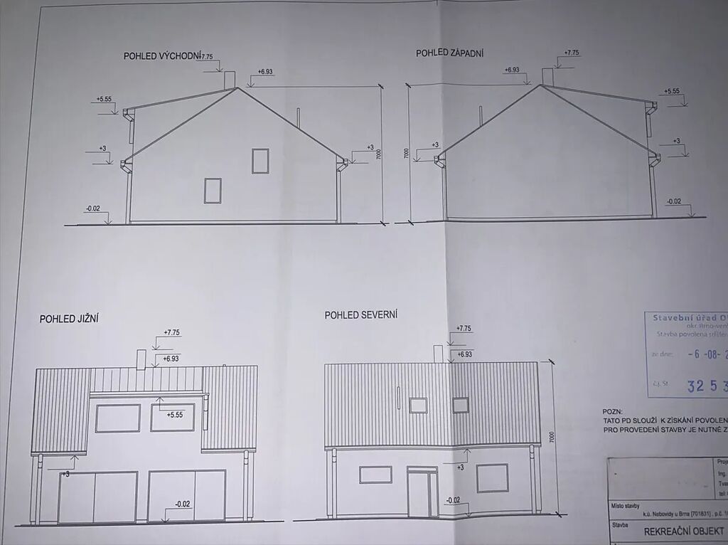 Ještě před změnou územního plánu obce Nebovidy bylo na pozemek vydáno pravomocné stavební povolení a vypracován projekt domu o dispozici 5+kk s obytným podkrovím a podlahovou plochou přibližně 166 m². Dům je navržen na půdorysu 10 × 10 m a uliční šíře pozemku činí přibližně 14,5 m. Nový majitel může projekt převzít nebo upravit dle svých představ formou změny stavby před dokončením. Součástí je rovněž stavební povolení na čistírnu odpadních vod. Na pozemku je elektřina a vlastní vrtaná studna, přístup je zajištěn po obecní komunikaci.