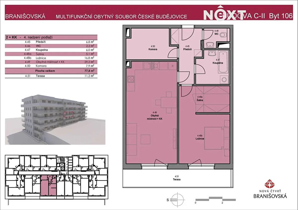 Exkluzivně nabízíme k pronájmu luxusní byt č. 106 2+kk o celkové ploše přes 70 m², situovaný ve čtvrtém nadzemním podlaží moderního bytového domu s celkem šesti podlažími. Byt je orientován na západ, což mu zajišťuje dostatek odpoledního světla, a díky umístění v druhé budově nabízí klidný výhled do vnitrobloku, na upravenou zahradu i okolní přírodu.