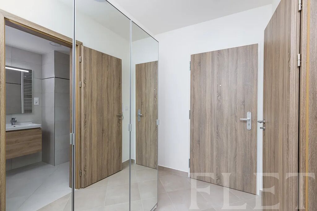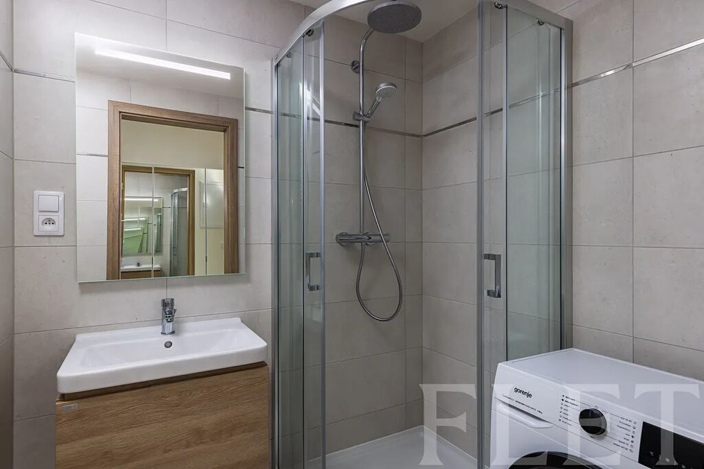 Součástí koupelny se sprchovým koutem a toaletou je také pračka. Byt je vybaven moderním systémem větrání s rekuperací tepla. V předsíni je připravena zrcadlová skříň, která zajišťuje dostatek úložného prostoru pro vaše osobní věci. Součástí pronájmu je také sklepní kóje a parkovací stání přímo v domě.