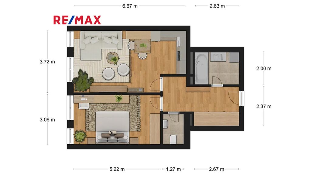 Jednotka se nachází ve 2.NP bytového domu s výtahem. Díky své užitné ploše 56m² působí byt velmi vzdušně, prostorně a komfortně. Dispoziční uspořádání jednotlivých místností je nejlépe patrné z vizualizace ve fotogalerii. Byt je ve velmi dobře udržovaném stavu, disponuje také zánovní kuchyňskou linkou s vestavěnými spotřebiči.