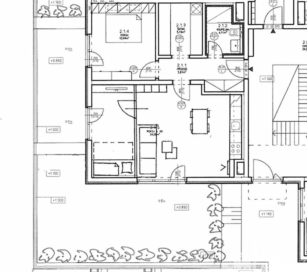 Obří terasa, přístupná ze všech obytných místností. Předsíň, koupelna se sprchou a WC, obývák s kuchyňskou linkou, jedna ložnice s přístupem z obýváku a druhá ložnice se vstupem z předsíně, samostatná šatna se skříněmi, s pračkou a sušičkou. Všechny tři pokoje mají přímý vstup na terasu, která patří pouze k tomuto bytu.