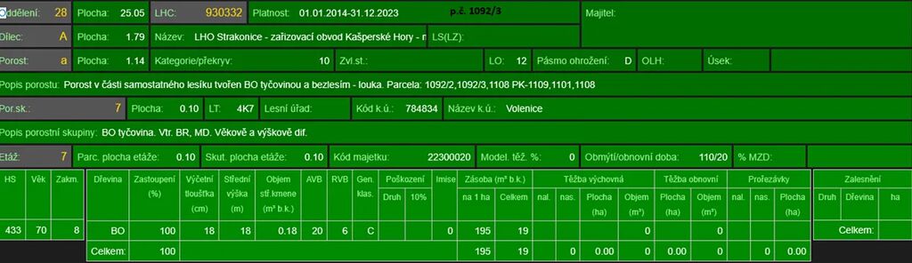- p.č. 1092/3 vedená jako lesní pozemek o celkové výměře 2 224 m2, vlastníme podíl 1/3 tedy 741 m2 (stáří lesa 81 let - hlavní zastoupení dřevin borovice),