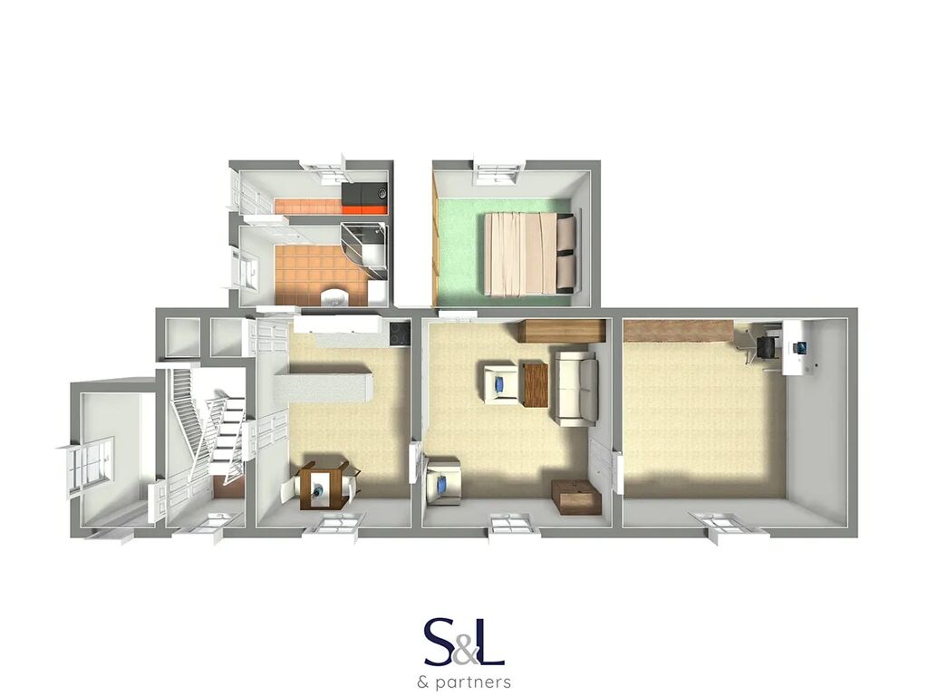 Přízemí nabízí dvě ložnice, obývací pokoj, kuchyň s jídelnou, koupelnu se sprchovým koutem, samostatné WC, kotelnu, zádveří a předsíň se schodištěm do podkroví. V podkroví se nachází předsíň a ložnice se vstupem na prostornou terasu, ideální pro chvíle odpočinku.
