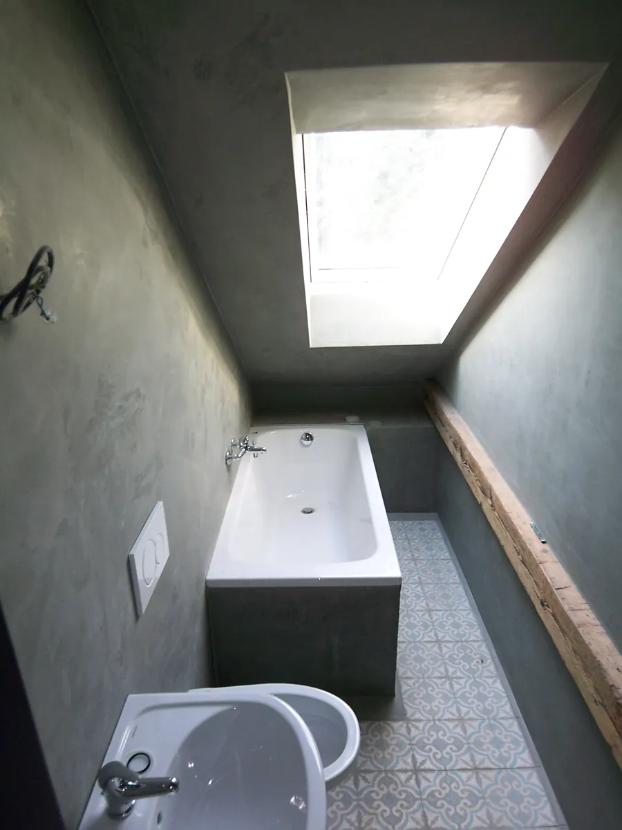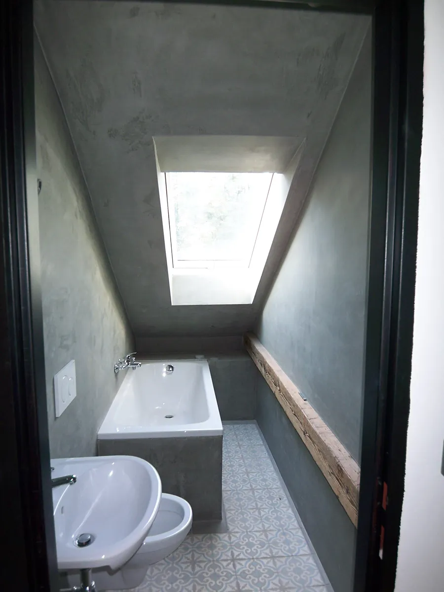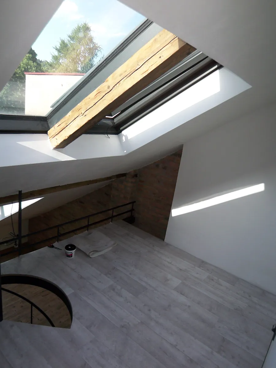 Velice světlý byt, velká střešní okna, industry design s prvky skla, kovu a dřeva.