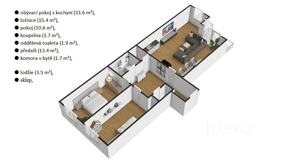 Byt je světlý, vzdušný, prostorný a ve skvělé lokalitě. Jeho velikost je 80 m² (88 m² včetně svislých konstrukcí) + lodžie 3,5 m² + sklep 2 m². Velkou výhodou tohoto bydlení je rozhodně jeho velikost, náklady na bydlení, lodžie, komora přímo v bytě, sklep, venkovní parkovací stání a umístění domu. Na lodžii si můžete vychutnat ranní kávu nebo si odpočinout po náročném dni.