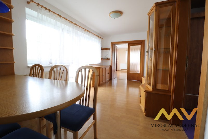Dispozice: kuchyň s jídelnou, 3x pokoj, koupelna, WC, komora, chodba, 2x balkon, garáž, zahrada. Dispozičně byt nabízí prostornou kuchyň s jídelním koutem, tři samostatné pokoje, koupelnu s vanou i sprchovým koutem, samostatnou toaletu, komoru s úložnými regály, chodbu a dva balkóny. Součástí pronájmu je garáž. Byt je částečně zařízen – k dispozici je kuchyňská linka se spotřebiči (el. sporák, sklokeramická varná deska, přípojka na myčku), jídelní stůl se židlemi, prosklená skříň a šatní skříň v ložnici. Obývací pokoj zůstává nezařízen.