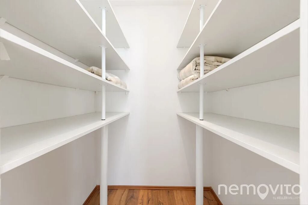 Byt je řešen ve dvou podlažích, přičemž zóna hlavní ložnice a dětí je oddělená. Rodiče tedy dole s vlastní šatnou i koupelnou, dětské ložnice s druhou koupelnou nahoře. Obývák je od kuchyně oddělený, linka je umístěná ve vstupní části bytu a k dispozici má také komoru/technickou místnost. Z hlediska úložných prostor je cenná také půda, která je přístupná z horní chodby.