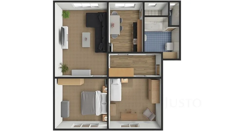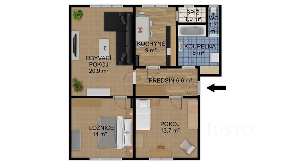 Dispoziční řešení bytu je 3+1 s užitnou plochou 72,5 m², v menším zděném domě bez výtahu.