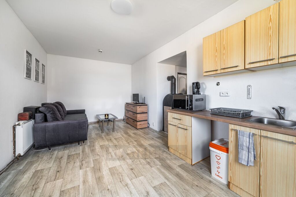 Stavba stojí na samostatném pozemku mimo zástavbu obce, což vám poskytne dostatek soukromí. Před nemovitostí je upravena plocha pro pohodlné parkování až dvou osobních aut. Jsou zde instalované nové vchodové dveře, které omezují tepelné ztráty během zimních měsíců. Z chodby se dostanete do ložnice, která je dostatečně prostorná pro umístěný dvoulůžkové postele a najdete zde velkou šatní skříň. Za druhými dveřmi poté najdete koupelnu, která je vybavena vanou se sprchou, toaletou a umyvadlem, pod kterým naleznete dostatek prostoru pro umístění pračky. V chodbě jsou umístěna krbová kamna, které pomocí výměníku zajišťují vytápění nemovitosti. Dominantou domu je poté prostorný obytný prostor s kuchyní, kde naleznete kuchyňský kout s dostatkem úložného prostoru a elektrickým sporákem s troubou. Z obývacího prostoru lze prosklenými dveřmi vstoupit na zpevněnou dřevěnou terasu, kterou zle případně odstranit. V pravé části nemovitosti dále najdete plechovou garáž, kterou lze využít jako úložný prostor.