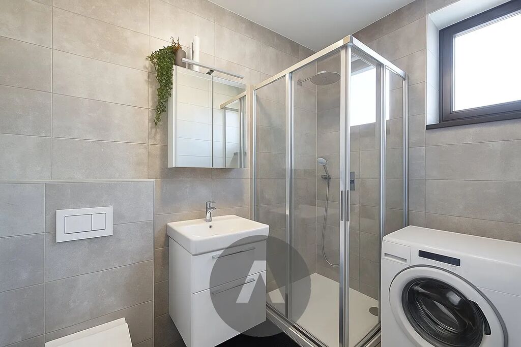 Koupelna: sprchový kout, umyvadlo, toaleta a přípojka pro pračku.