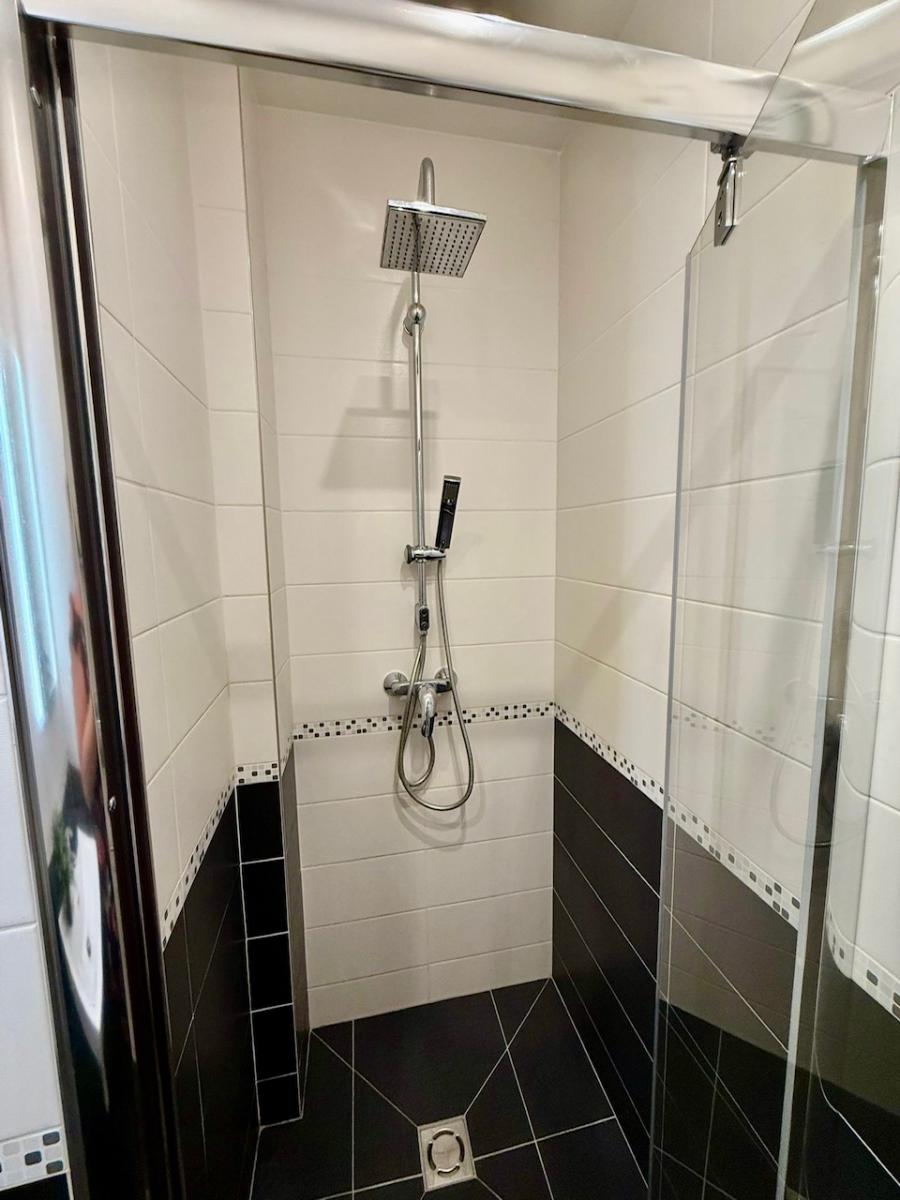 koupelna se sprchovým koutem, obývací pokoj s rozkládací sedačkou a obývací stěnou,