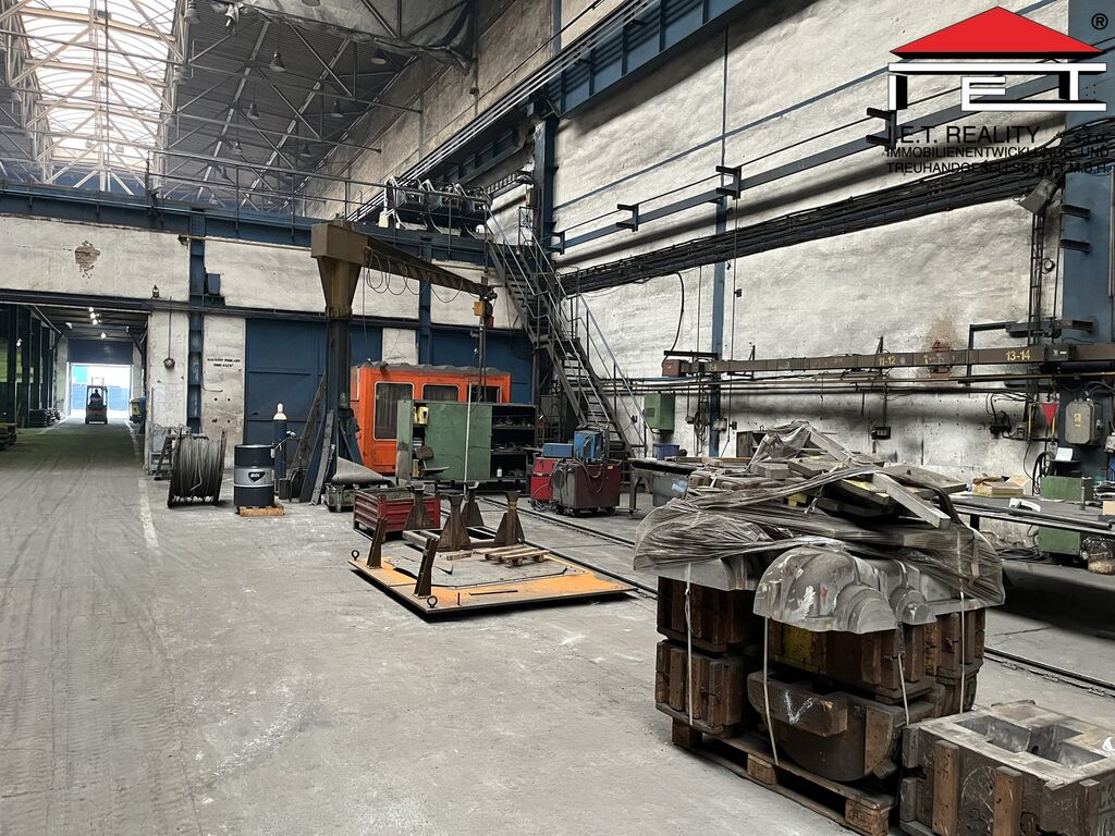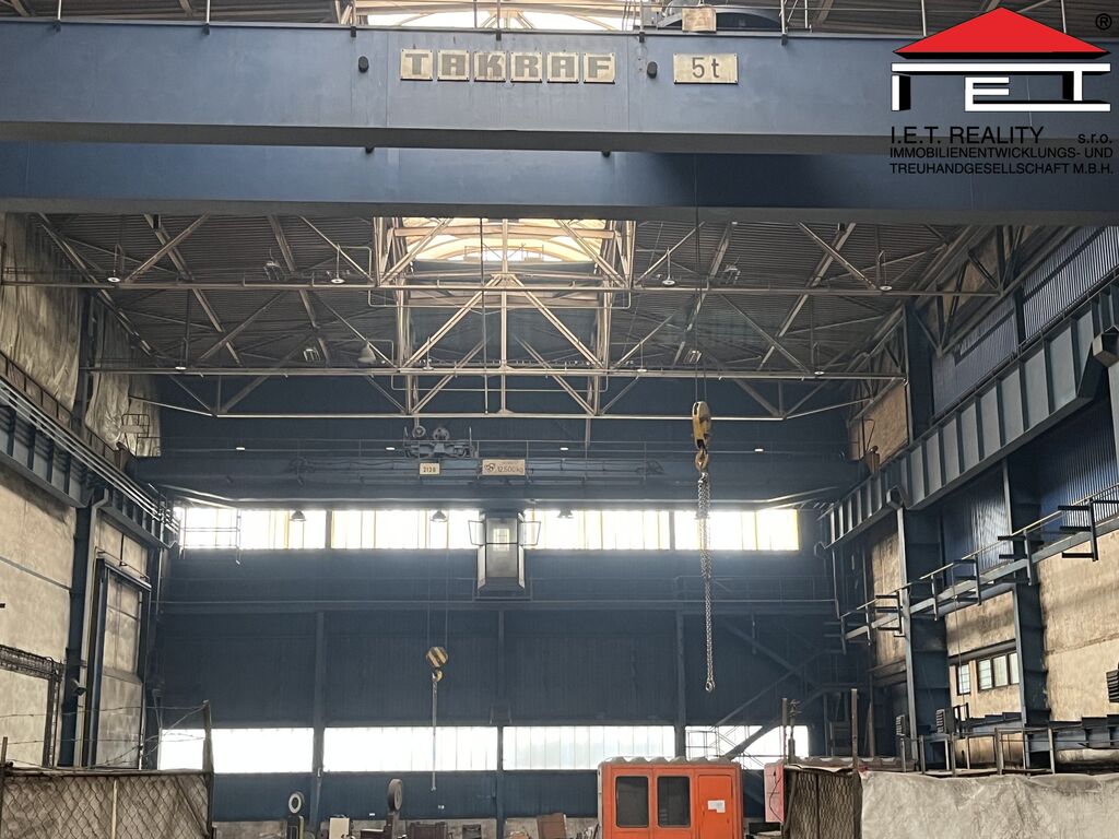 K pronájmu nabízíme výrobní/skladovou halu o ploše 1 992 m² s vlastními vraty 5 × 5 m, dvěma mostovými jeřáby (12,5 t a 5 t) a třemi sloupovými jeřáby. Hala má nosnost podlahy 7 000 kg/m², výšku jeřábů 11 m a je možné ji vytápět.