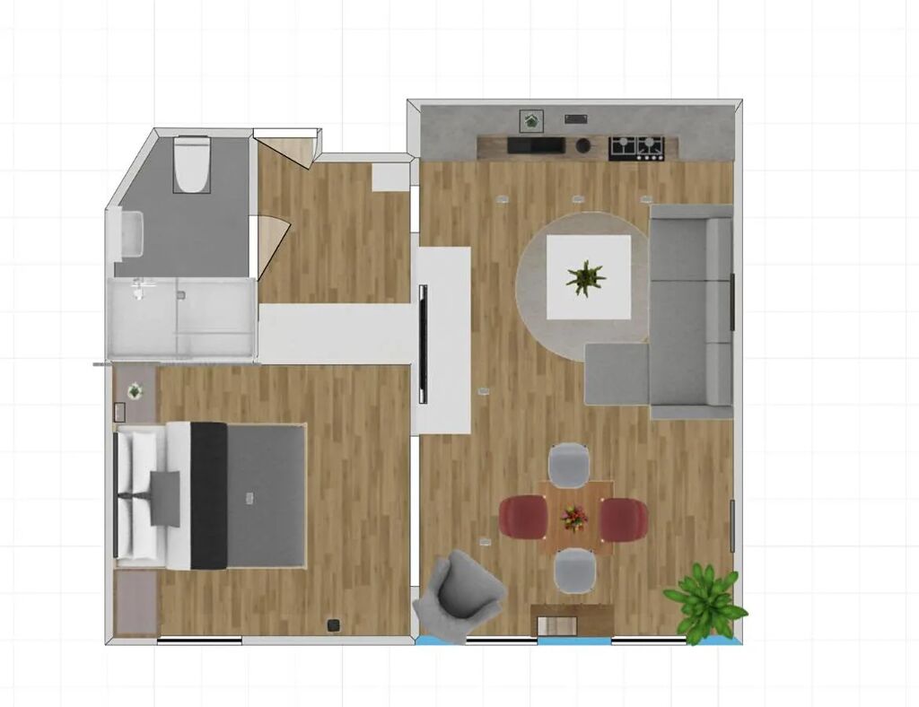 Byt disponuje prostorným obývacím pokojem s kuchyňským koutem, jednou samostatnou ložnicí a koupelnou se sprchovým koutem. Kuchyně je plně vybavená moderními spotřebiči, včetně myčky, lednice a trouby. V obývacím pokoji jsou velká okna, která zajišťují dostatek přirozeného světla a vytvářejí příjemnou atmosféru.