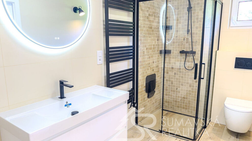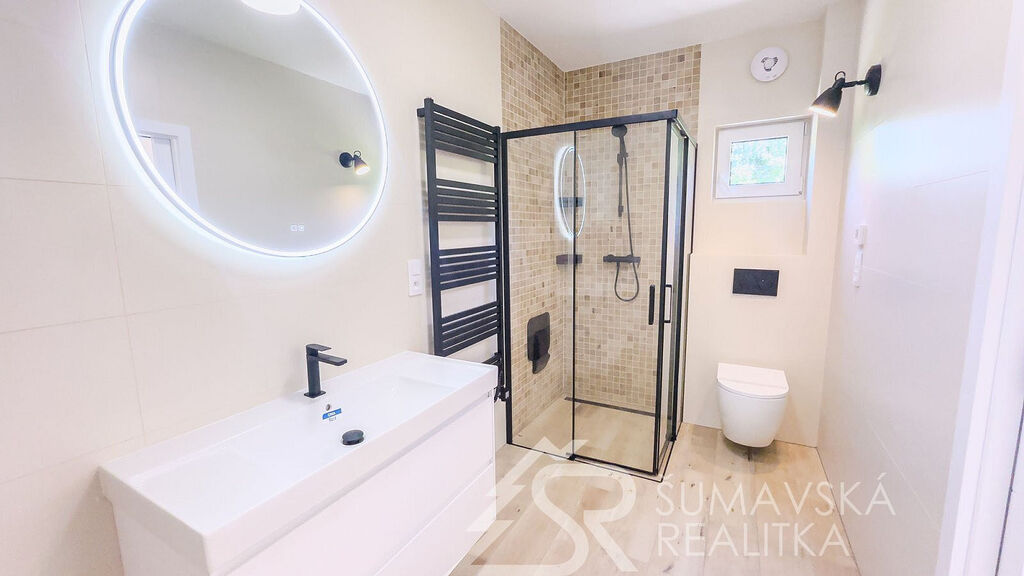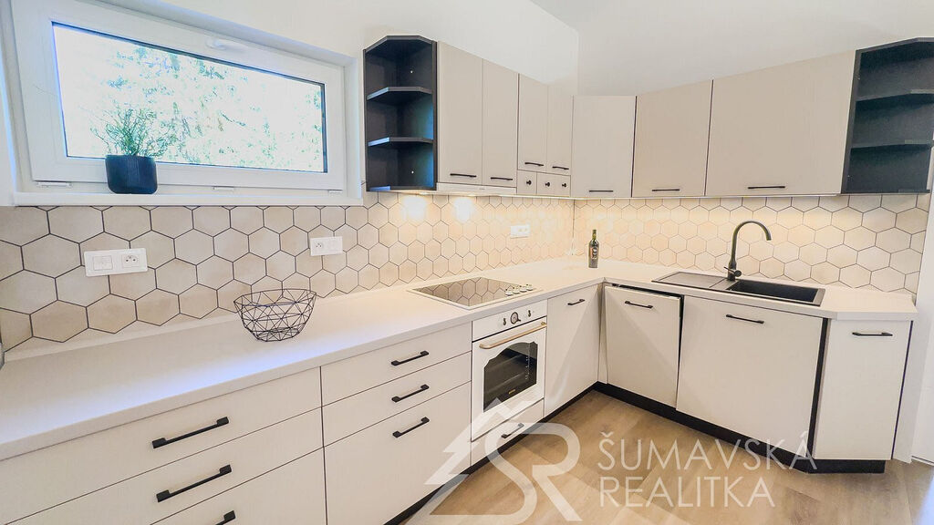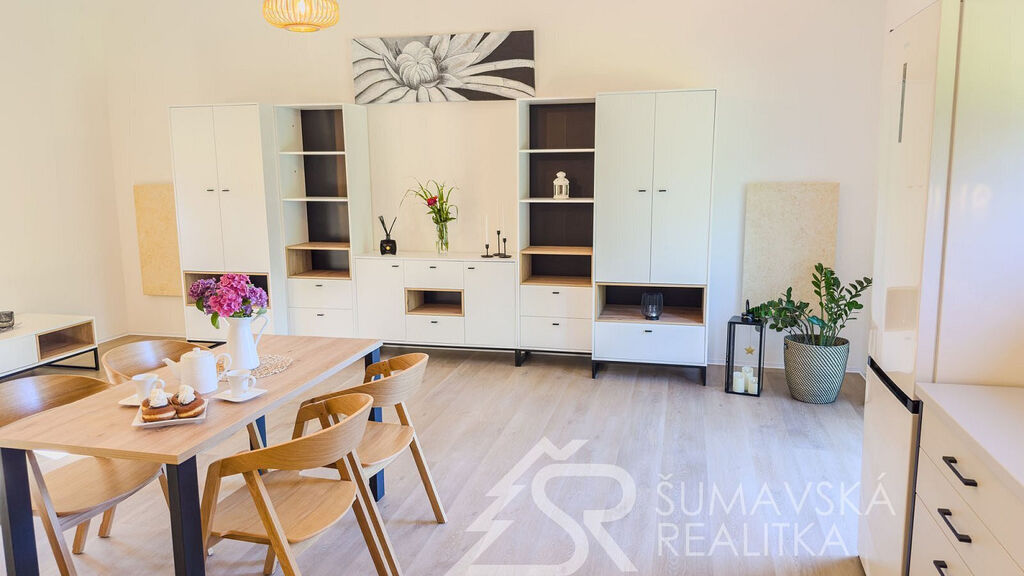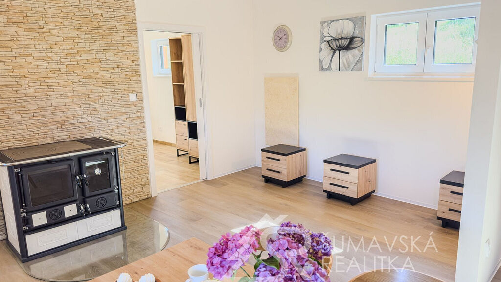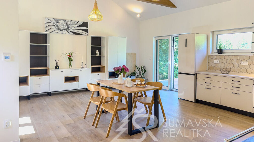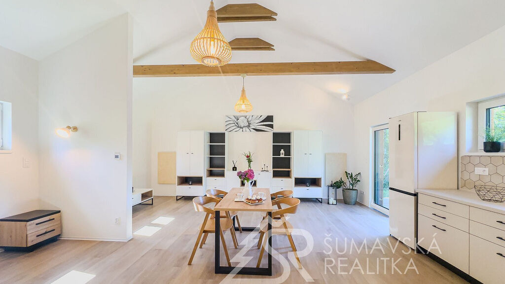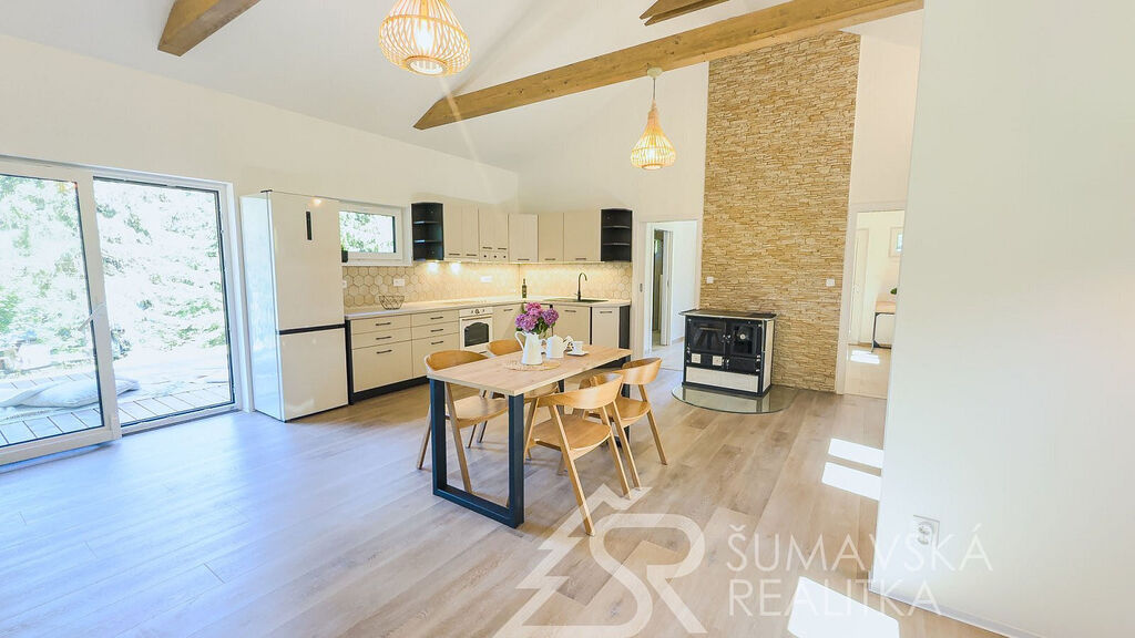 Vnitřní dispozice: 2kk s příslušenstvím. Hlavní místnost 42,5 m² je otevřená do krovu s částečně přiznanými prvky vazby, což vytváří velkorysý prostor s navazující terasou, jemuž dominuje nádherný výhled na hrad Kašperk. Je vybaven moderním nábytkem a rohovou kuchyňskou linkou MONARCH se spotřebičemi GORENJE – el. varná deska, digestoř, trouba, myčka, kombi lednice. Vše sladěné s interiérovými prvky – obklady, vinylovou podlahou, svítidly – a vše nové, nikdy nepoužité – viz video a fotogalerie. Přilehlá místnost 10,2 m² využitelná variabilně má i vlastní vchodové dveře. Vytápění obou místností mramorovými elektrickými sálavými panely zn. EUROTOPIN s komfortní regulací (nízká sazba) – pro útulnou atmosféru doplněné sporákem s troubou a plotnou zn. NORDICA s externím přívodem vzduchu a kapacitou vytopení obou místností. V obou místnostech příprava na TV. Koupelna 6,5 m² s nadstandardní sanitou SIKO – rohová sprcha, WC, umyv., el. bojler ARISTON VELIS 80, příprava na pračku se sušičkou. Koupelna má el. podlahové vytápění.