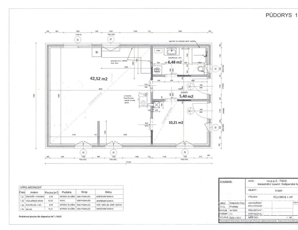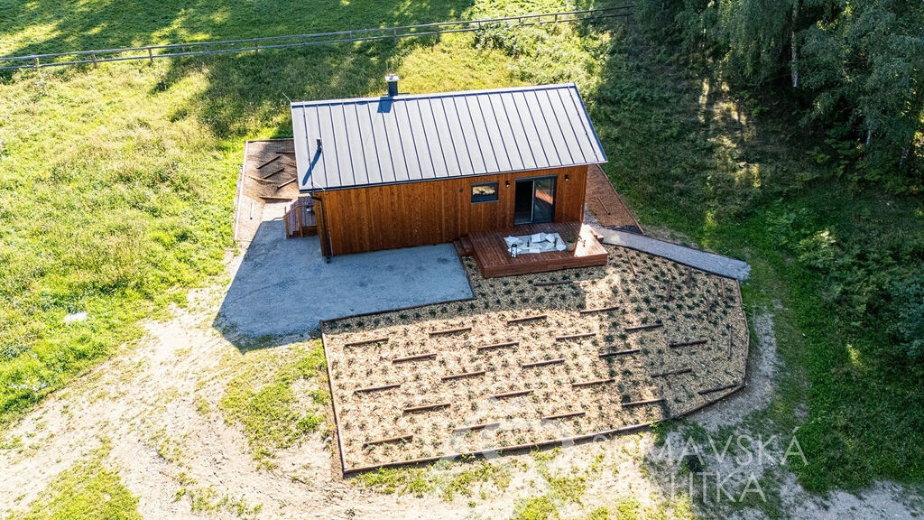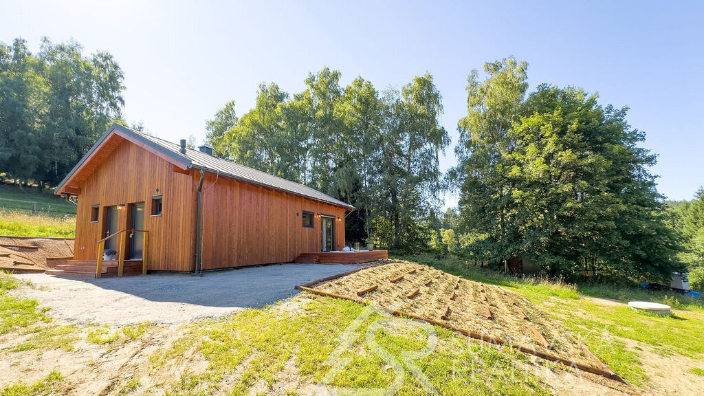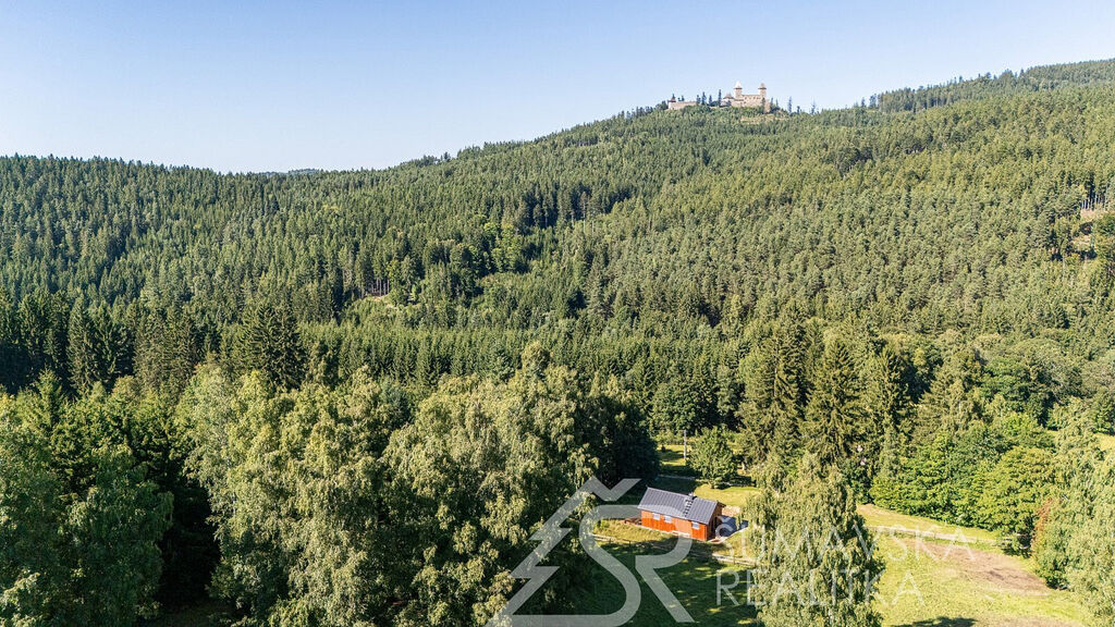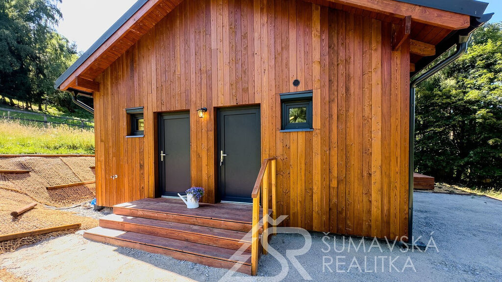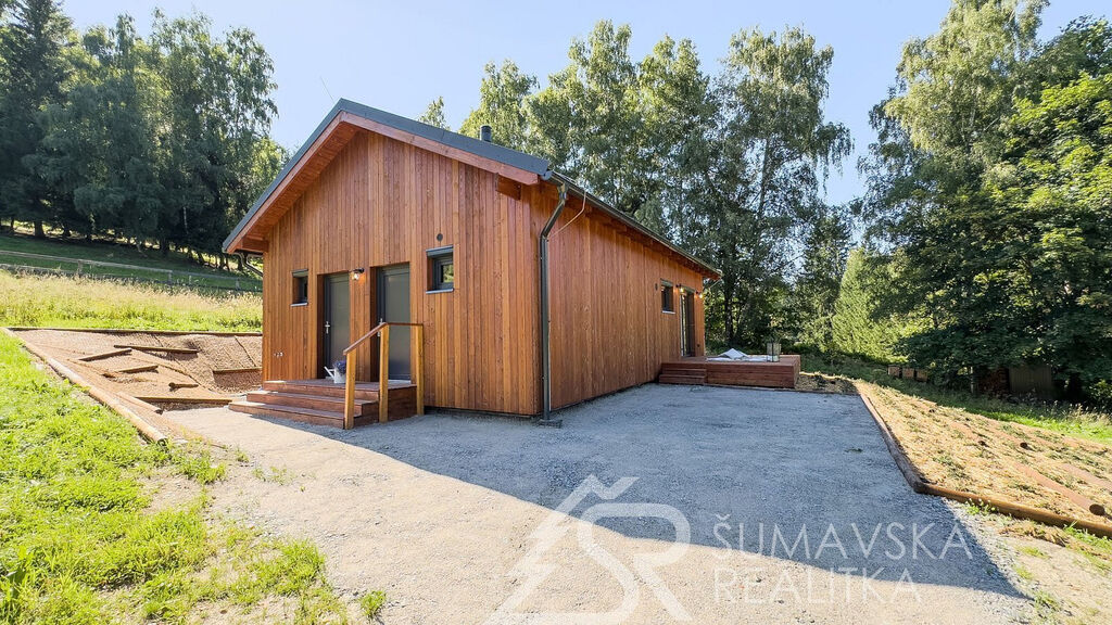 Popis stavby: atypická komfortní novostavba se zast. pl. 77 m², . real.2024-25, zkolaudovaná v lednu 2025. Kvalitní dřevostavba se sedlovou střechou krytou falcovaným plechem SATJAM Rapid DeLux je zvenku kompletně obložená modřínem a má parametry obytné nemovitosti určené k celoročnímu využití v horských podmínkách. Byla realizována specializovanou firmou EASY HOME Plzeň jako individuální záměr na klíč – kompletně od základů až po nadstandardní sanitu a detaily – např. el. ovládané venkovní rolety a vnitřní žaluzie. Všechny interiérové dveře jsou posuvné do pouzder. Okna plastová s izolačními trojskly.