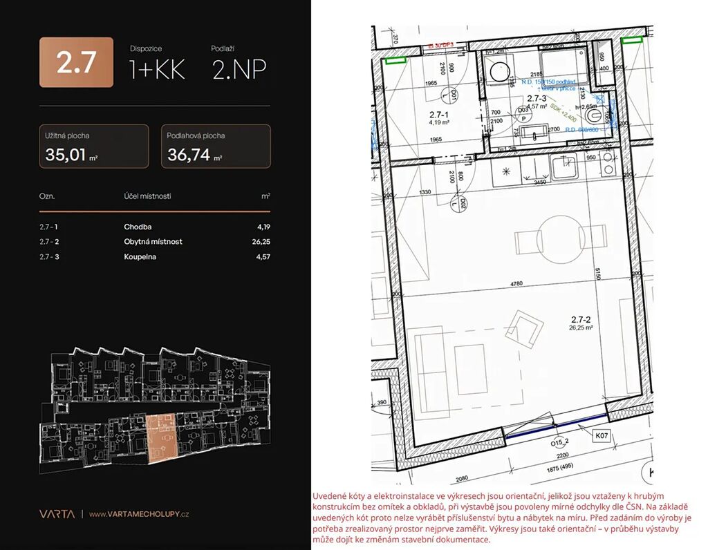 Dovolujeme si vám nabídnout k pronájmu nový byt 1+kk o celkové výměře 35 m², umístěný v 2.NP, který je součástí projektu VARTA Měcholupy na rozhraní pražské Hostivaře a Horních Měcholup.