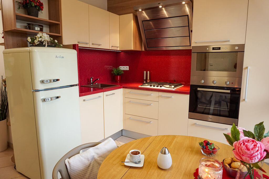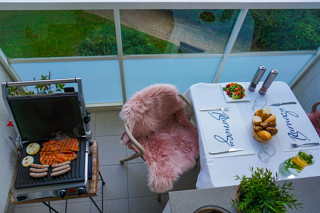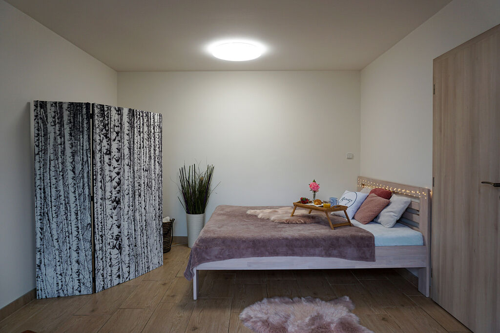 Jedná se o prostorný byt s dvěma pokoji a kuchyňským koutem. V ložnici je manželská postel a televize. Kuchyně je moderní, plně vybavená novými a kvalitními spotřebiči: vestavěnou mikrovlnnou troubou, pečící troubou, myčkou, samostatně stojící lednicí a digestoří. V koupelně jsou použity kvalitní baterie značky Grohe. Součástí bytu je i prostorná šatna.
