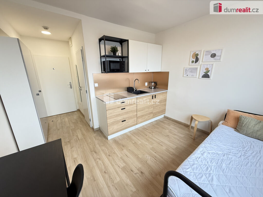 Dumrealit.cz Vám zprostředkuje možný pronájem zařízeného bytu 1+kk na Praze 5 v Jinonicích v 8. patře domu s výtahem, v projektu VBLOKU. Byt se nabízí kompletně zařízený, je menší, ale přesto velmi prakticky dispozičně řešený a plnohodnotně vybavený. Je vybavený moderní kuchyňskou linkou se spotřebiči (lednice, mikrovlnná trouba,sklokeramická varná deska). V prostoru se dále nachází klasický jídelní/ pracovní stůl se židlí a pohodlná malá postel. Koupelna se sprchovým koutem a umyvadlem s rozměrným zrcadlem je obložena bílými obklady a dlažbou modré barvy. Úložné prostory Vám nabídne šatní skříň umístěna na chodbě. Využívat můžete také společné prostory rezidence – zahradu (včetně grilu), komunitní zahrádku pro pěstování bylinek a zeleniny nebo TV room. Zároveň zde funguje nonstop recepce, prádelna, sušárna a fitness centrum. K nastěhování ihned. Doporučuji. Ev. číslo: 652658.