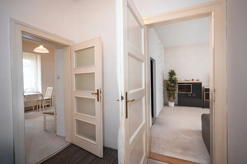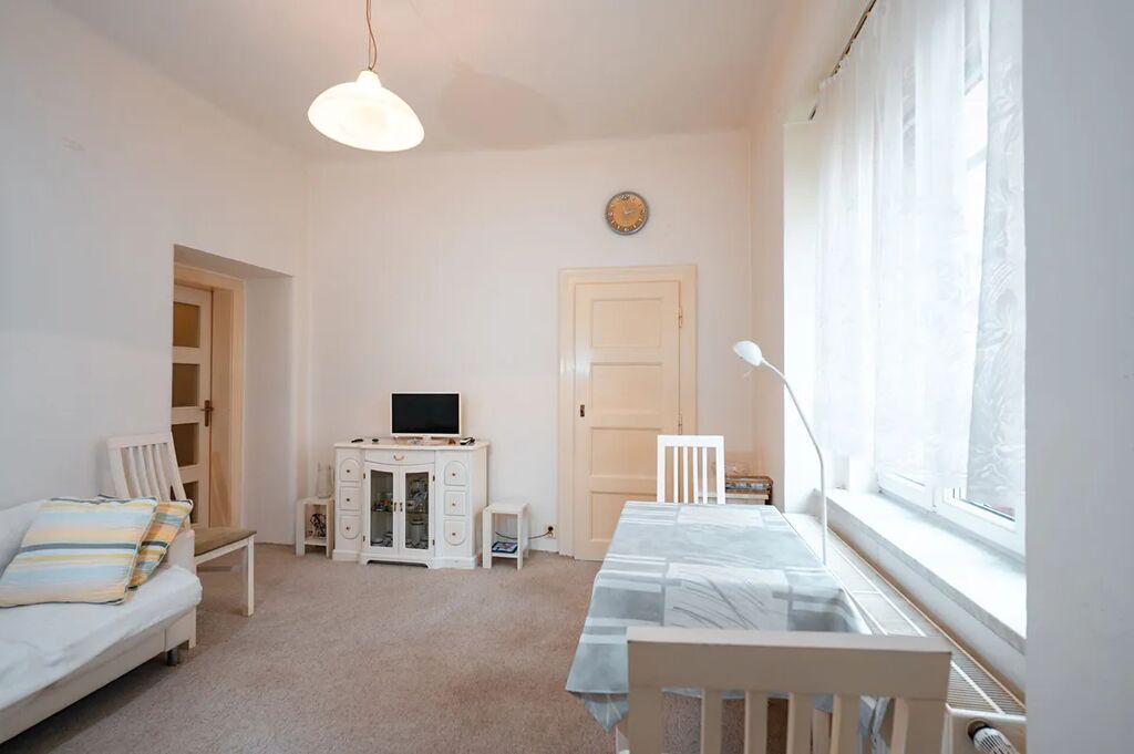 Byt byl původně řešen jako 2+1, po úpravě nabízí praktické uspořádání 3+kk. Světlé místnosti, vysoké stropy a klidná atmosféra domu zajišťují pohodlné bydlení vhodné jak pro jednotlivce, tak pro rodinu nebo jako investice.