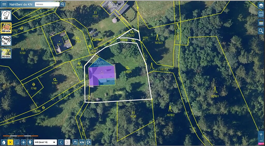 1664 m2 travnatého pozemku vč. zastavěné plochy. K tomu se nabízí 1/2 pozemku trvalý travní porost (se vzrostlými náletovými dřevinami) o ploše 2136 m2 (není uveden v zákresu ve fotogalerii, ale na pozemky kolem chalupy navazuje).