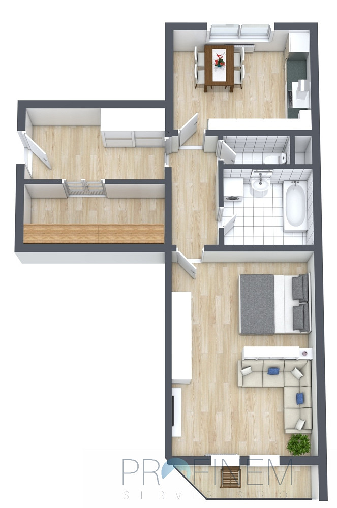 Bytová jednotka se skládá z chodby, šatny (možno využít i jako pracovnu), kuchyně, obývacího pokoje se vstupem na balkon, koupelny s vanou a samostatného WC. K dispozici je rovněž sklepní kóje.