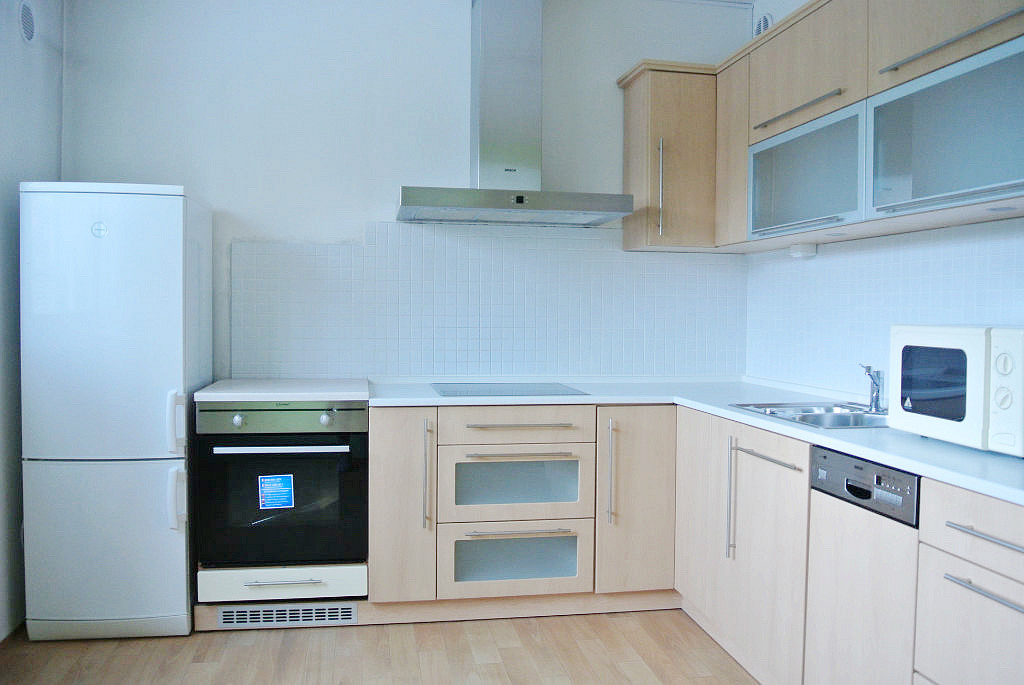 V kuchyni je k dispozici prostorná kuchyňská linka s elektrickou varnou deskou, troubou, digestoří, myčkou a lednicí. Obývací pokoj je orientován do vnitrobloku, což zajišťuje příjemné tiché prostředí. Pro dokonalé zatemnění jsou na oknech předokenní rolety.