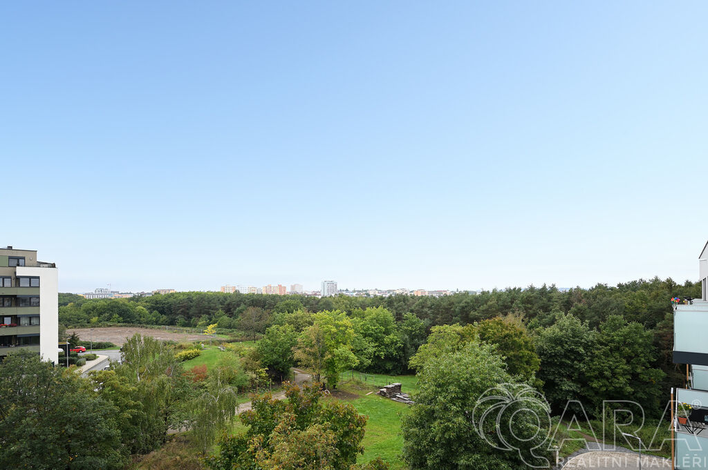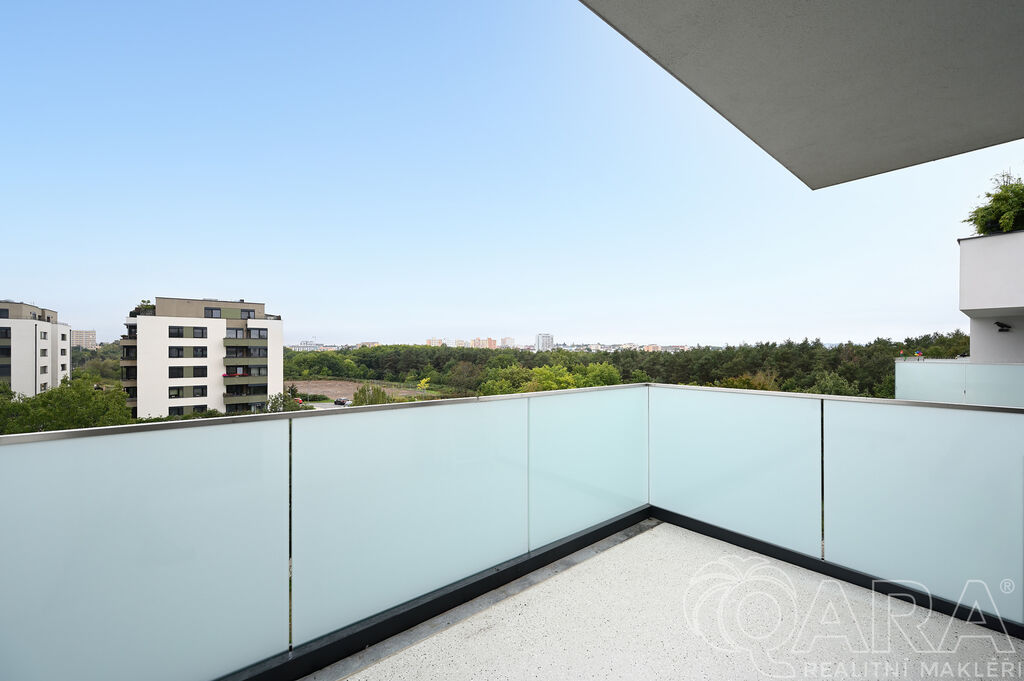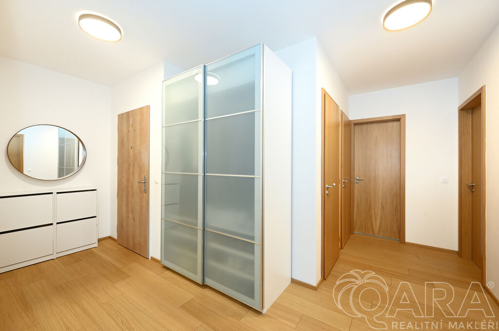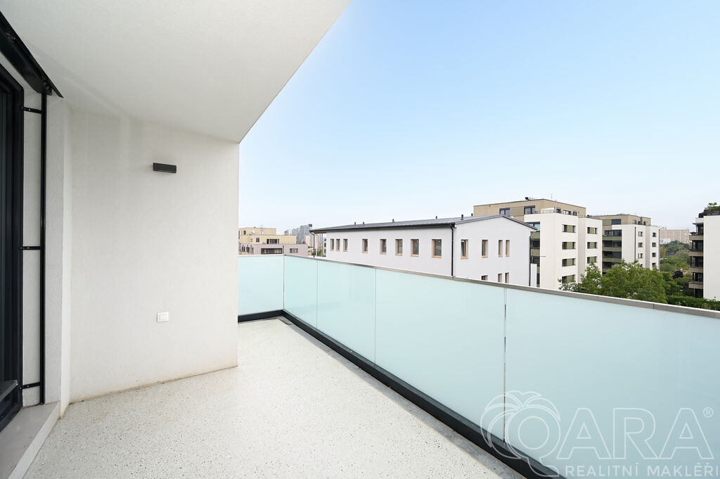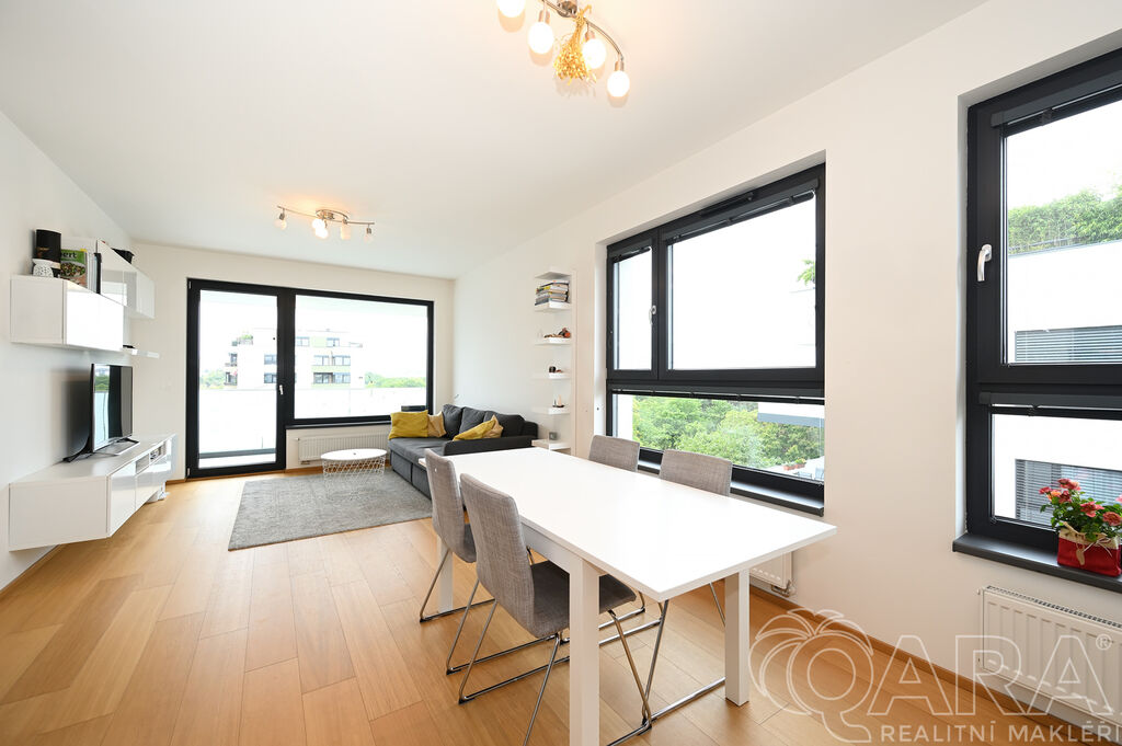 Po vstupu vás přivítá chodba, ze které se dostanete do prostorného obývacího pokoje s moderním kuchyňským koutem. Ten je plně vybaven vestavěnými spotřebiči, mezi které patří lednice s mrazákem, elektrická trouba, sklokeramická varná deska, digestoř a myčka. Součástí obývacího pokoje je i jídelní část s vnitřními žaluziemi. Na balkon o velikosti 11,6 m² je přímý vstup jak z obývacího pokoje, tak i z hlavní ložnice, což nabízí pohodlné propojení obou místností s venkovním prostorem.