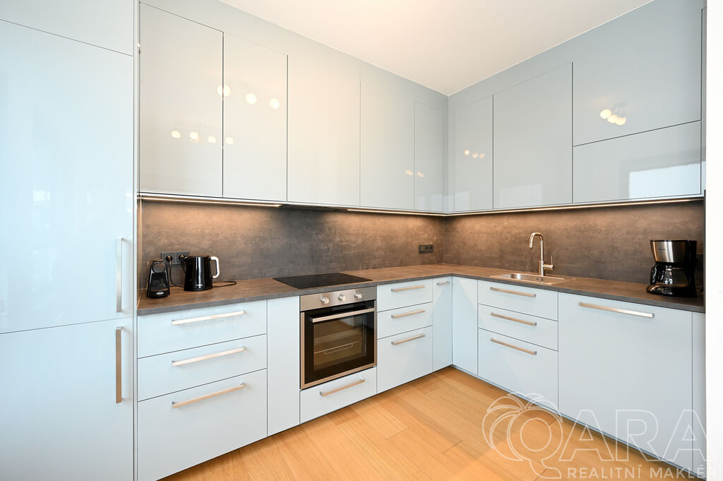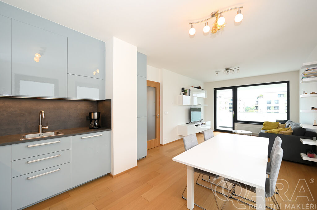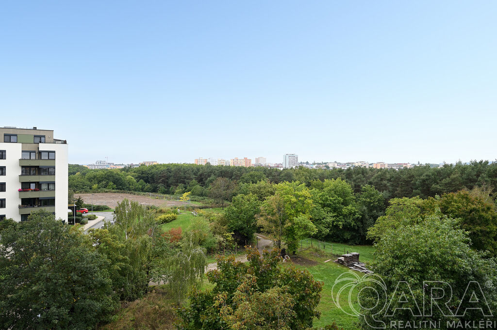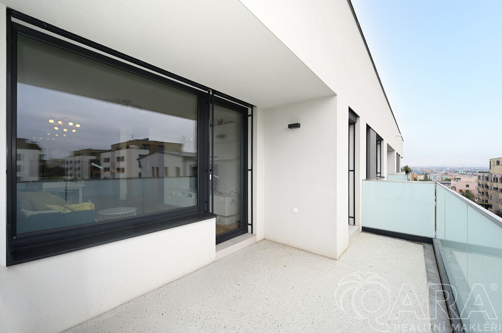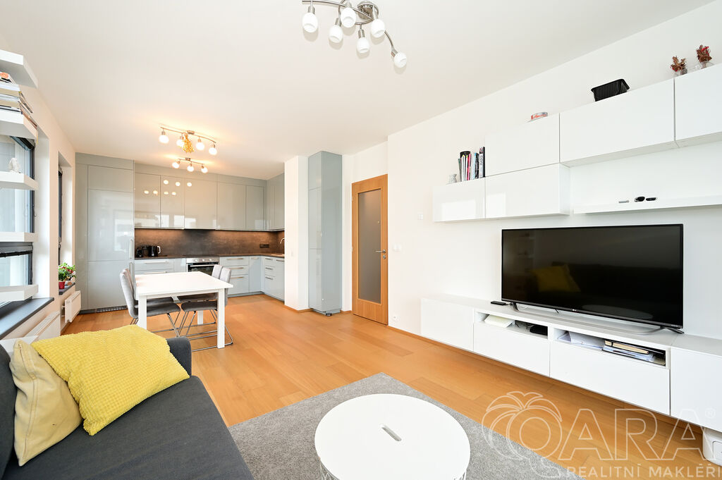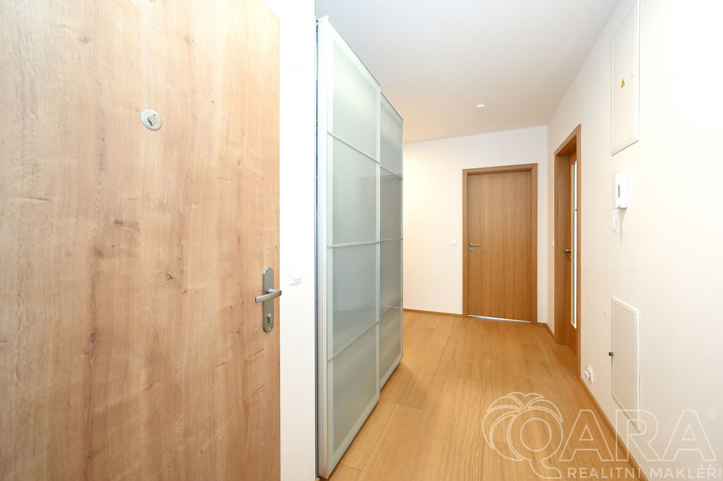 Po vstupu vás přivítá chodba, ze které se dostanete do prostorného obývacího pokoje s moderním kuchyňským koutem. Ten je plně vybaven vestavěnými spotřebiči, mezi které patří lednice s mrazákem, elektrická trouba, sklokeramická varná deska, digestoř a myčka. Součástí obývacího pokoje je i jídelní část s vnitřními žaluziemi. Na balkon o velikosti 11,6 m² je přímý vstup jak z obývacího pokoje, tak i z hlavní ložnice, což nabízí pohodlné propojení obou místností s venkovním prostorem.