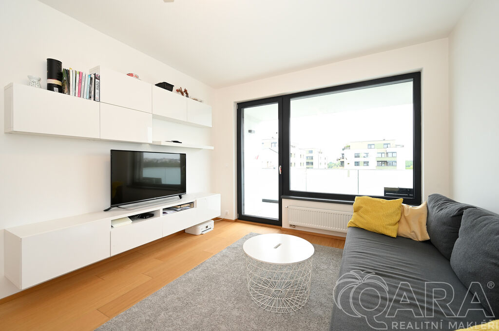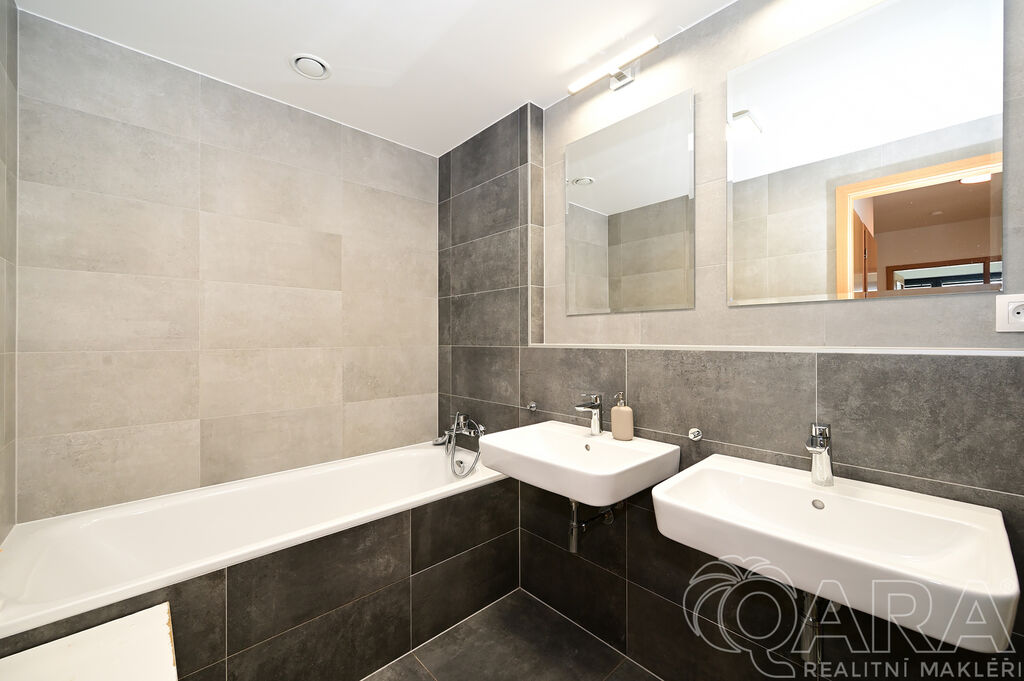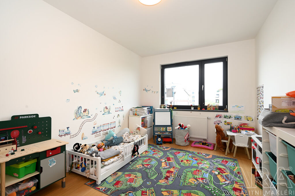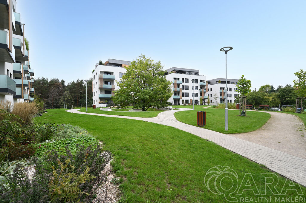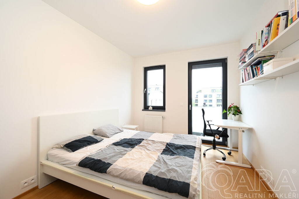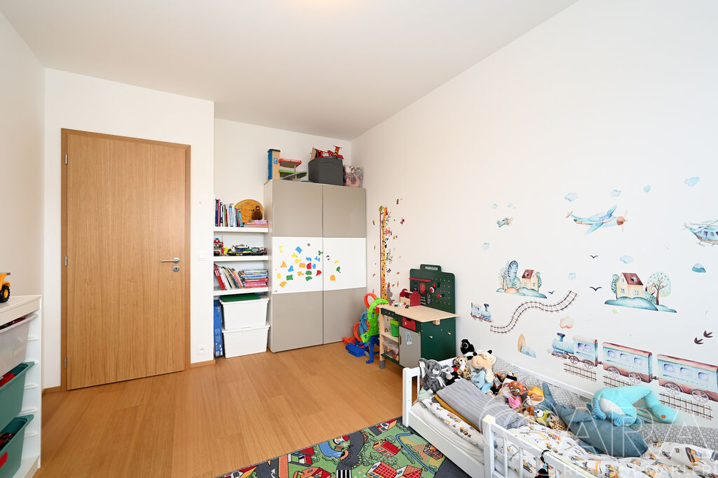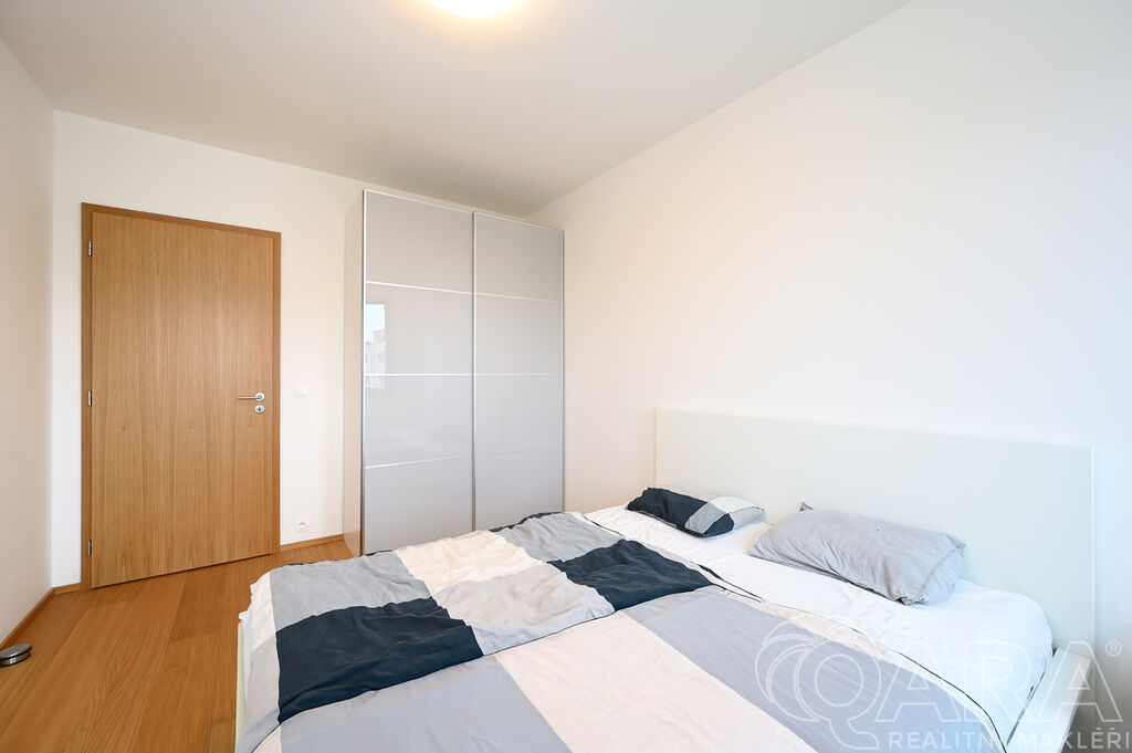 Byt dále disponuje dvěma pokoji o velikosti 14,2 m² a 13,2 m² a praktickou komorou připravenou pro umístění pračky a sušičky, které nejsou součástí pronájmu. Koupelna je vybavena vanou a samostatná toaleta s umyvadlem zajišťuje vyšší komfort. O pohodlí se starají kvalitní materiály a detaily, jako jsou hliníková okna s trojskly, dřevěné dýhované podlahy v pokojích i obývacím pokoji, sanita značky Villeroy & Boch a elektrické venkovní žaluzie na dálkové ovládání. Samotná budova je zařazena do energetické třídy B (velmi úsporná), díky čemuž se jedná o nízkoenergetickou rezidenci s nižšími provozními náklady. K bytu je navíc možné pronajmout i druhé parkovací stání za cenu 2 500 Kč měsíčně.
