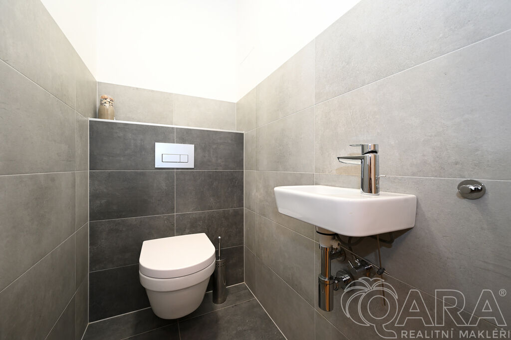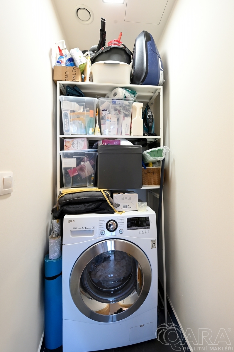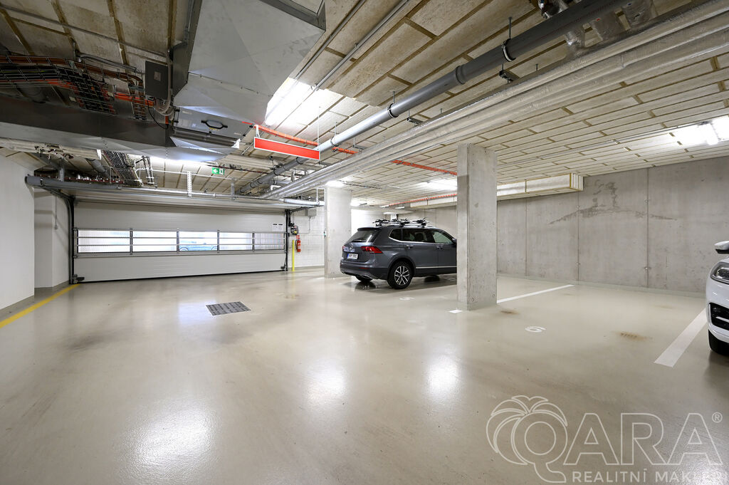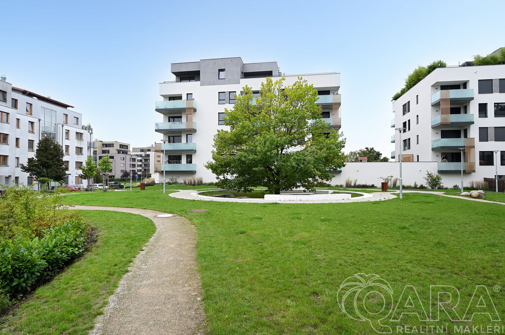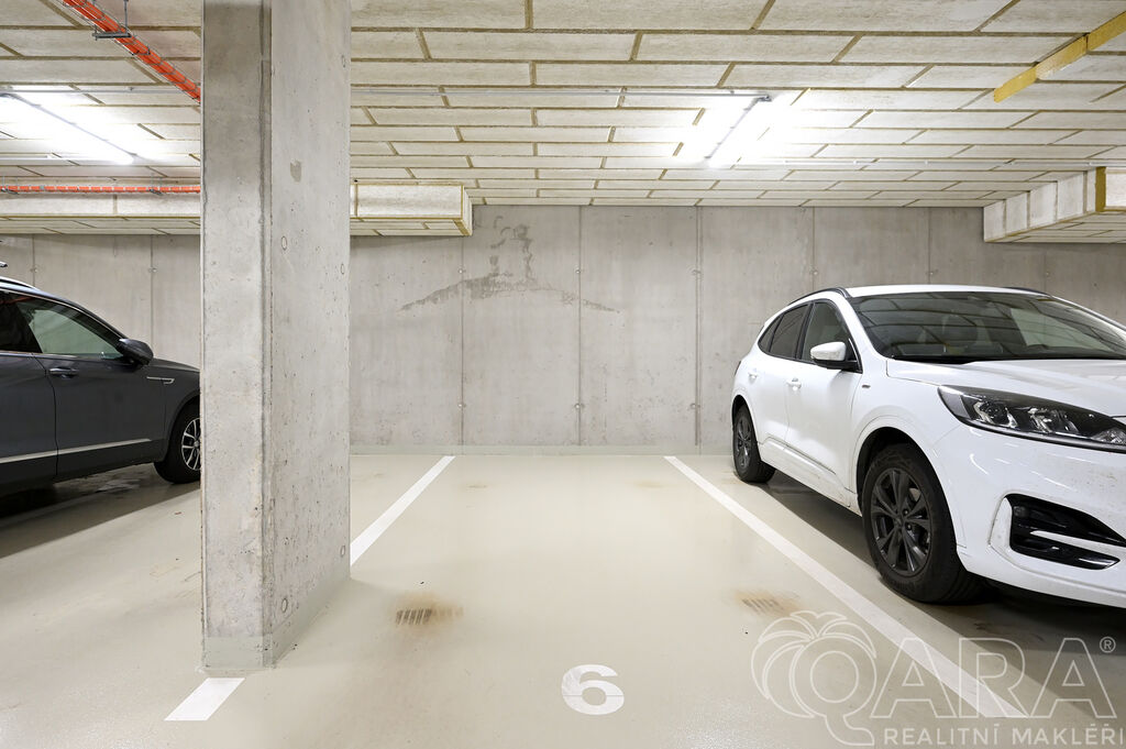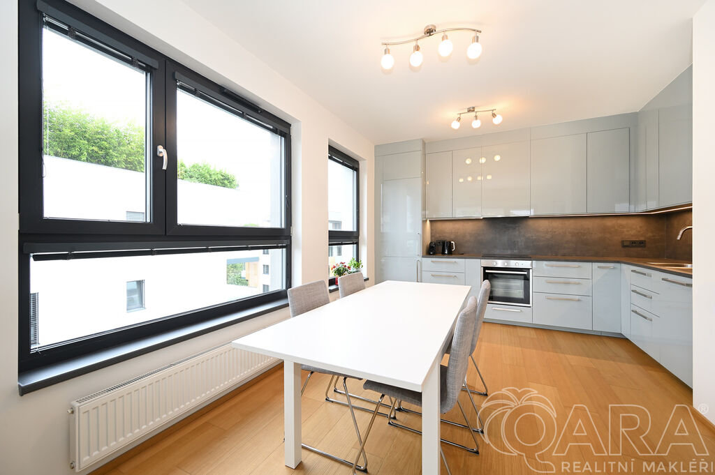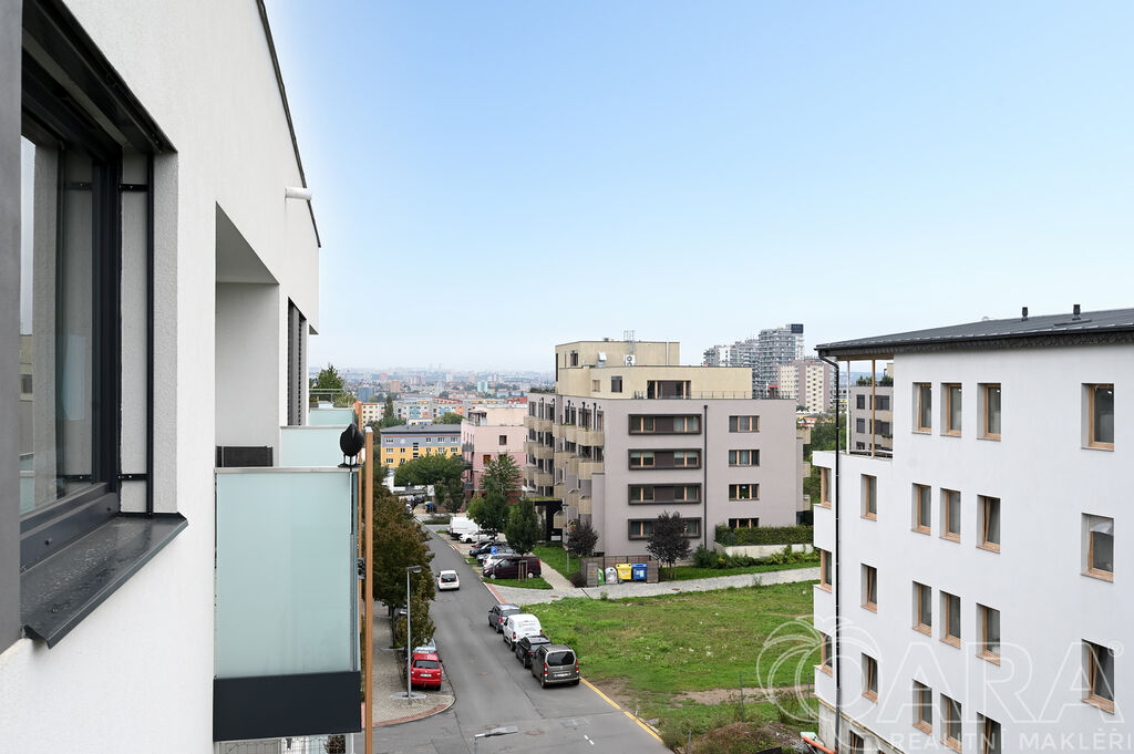 Byt dále disponuje dvěma pokoji o velikosti 14,2 m² a 13,2 m² a praktickou komorou připravenou pro umístění pračky a sušičky, které nejsou součástí pronájmu. Koupelna je vybavena vanou a samostatná toaleta s umyvadlem zajišťuje vyšší komfort. O pohodlí se starají kvalitní materiály a detaily, jako jsou hliníková okna s trojskly, dřevěné dýhované podlahy v pokojích i obývacím pokoji, sanita značky Villeroy & Boch a elektrické venkovní žaluzie na dálkové ovládání. Samotná budova je zařazena do energetické třídy B (velmi úsporná), díky čemuž se jedná o nízkoenergetickou rezidenci s nižšími provozními náklady. K bytu je navíc možné pronajmout i druhé parkovací stání za cenu 2 500 Kč měsíčně.